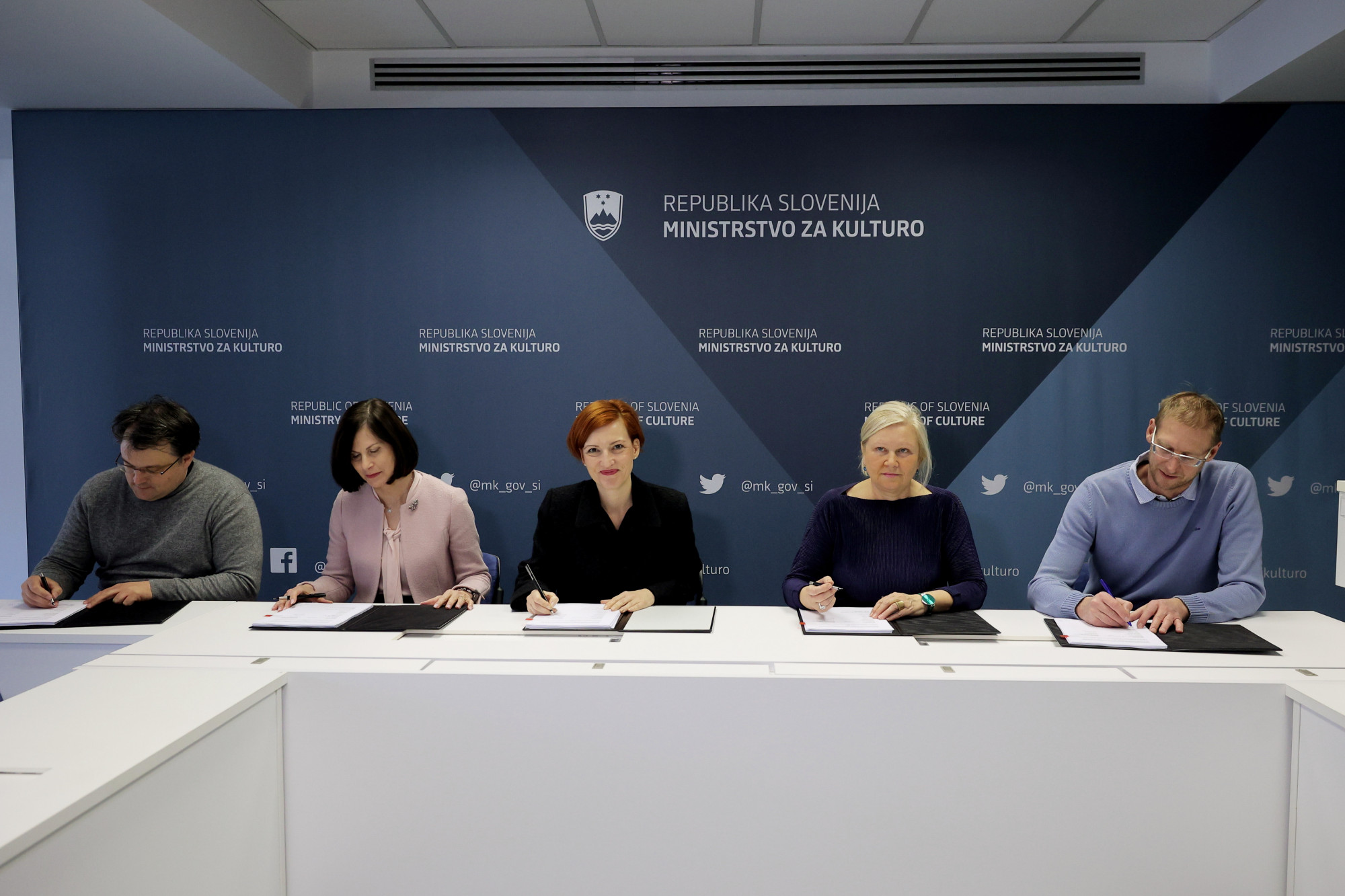 Ministrica za kulturo dr. Asta Vrečko je s predsednico in tremi člani Uprave RTV Slovenija, Natalijo Gorščak, Lukom Rupnikom, Nevenko Črnko in Francijem Pavšerjem, na Ministrstvu za kulturo podpisala pogodbo za sofinanciranje projekta samodejnega podnaslavljanja televizijskih oddaj. Na Ministrstvu za kulturo smo za projekt zagotovili sredstva v višini 1.204.411,76 evra, in sicer 630.000 evrov iz Programa evropske kohezijske politike 2021–2027 in 574.411 evrov iz proračuna Ministrstva za kulturo.