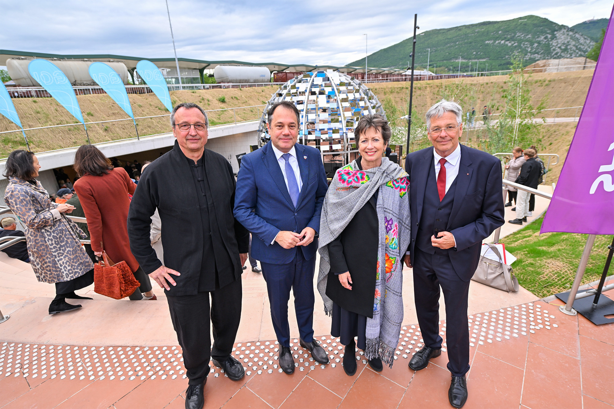 Poleg ministra Arčona so zbrane pozdravili tudi deželni glavar dr. Kaiser, Monika Kircher, članica upravnega odbora Koroške kulturne fundacije, ki je kupolo vse do jeseni posodila Evropski prestolnici kulture, direktorica javnega zavoda GO! 2025 Mija Lorbek in člani projektnega kolektiva Tanja Prušnik, Armin Guerino in Gerhard Fresacher.