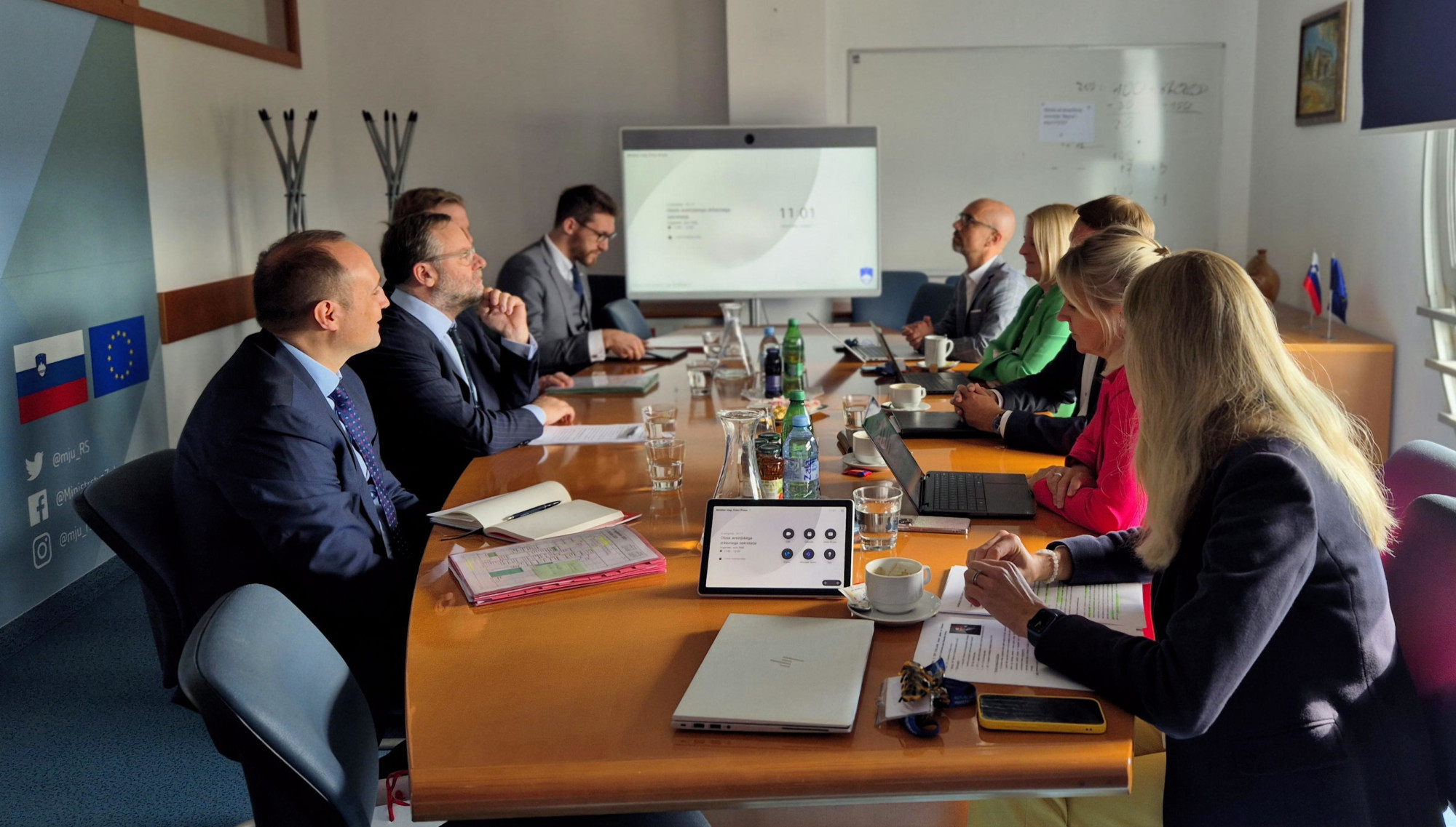 Ljudje sedijo za ovalno mizo in se pogovarjajo. Na sredini je velik ekran.