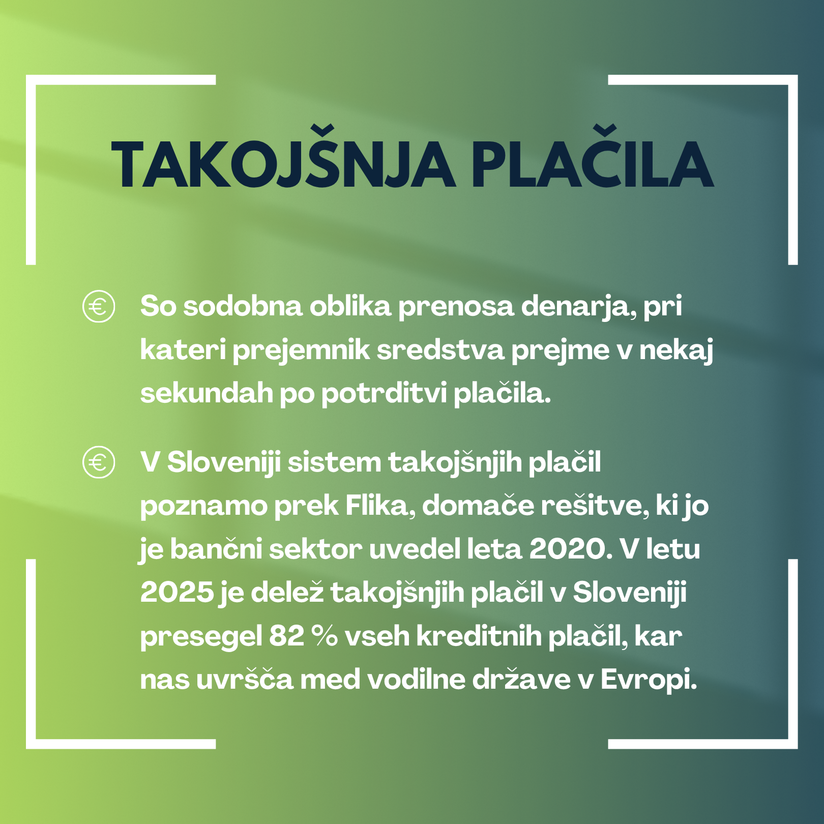 V Sloveniji sistem takojšnjih nakazil že poznamo prek Flika, domače rešitve, ki jo je bančni sektor uvedel leta 2020. V letu 2025 je delež takojšnjih plačil v Sloveniji presegel 82 odstotkov vseh kreditnih plačil, kar nas uvršča med vodilne države v Evropi na področju razvoja in uporabe takojšnjih plačil.
