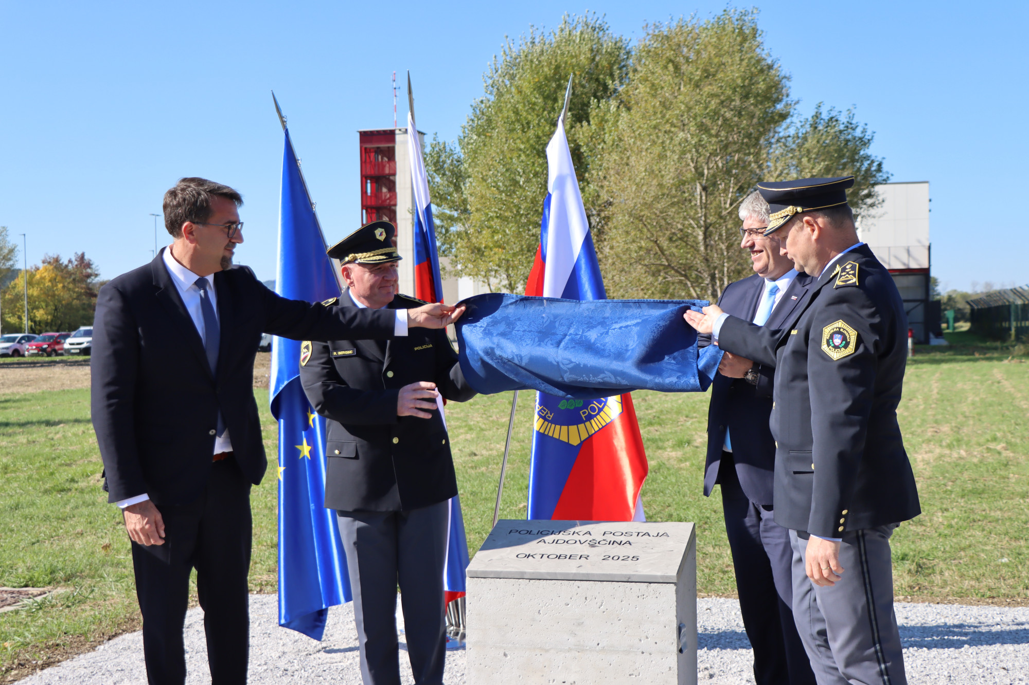 Direktor Policijske uprave Nova Gorica Robert Berginc, župan Občine Ajdovščina Tadej Beočanin, minister za notranje zadeve Boštjan Poklukar in generalni direktor policije Damjan Petrič | Avtor: Ministrstvo za notranje zadeve