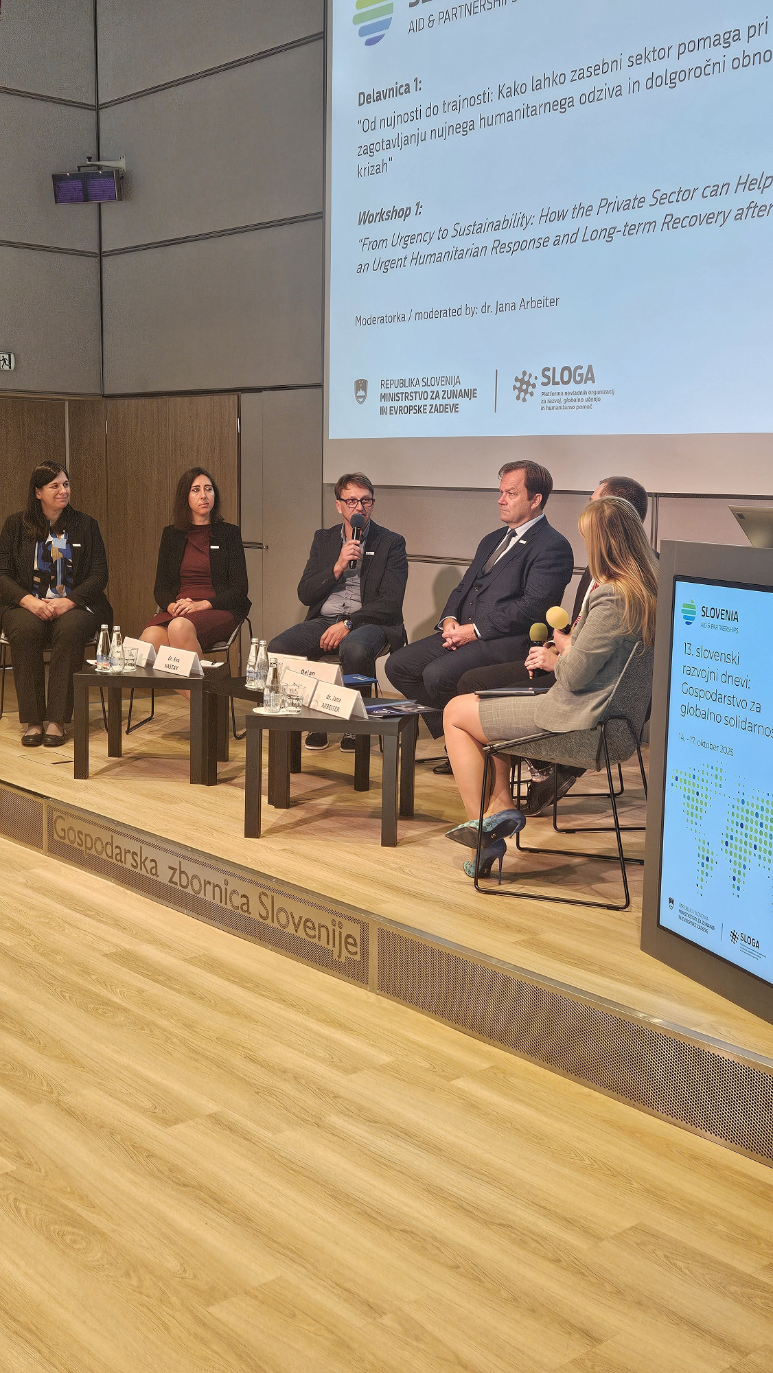 V petek, 17. oktobra, je bilo dogajanje na Gospodarski zbornici posvečeno prenosu praktičnega znanja, predstavitvi dobrih praks in konkretnih priložnosti za vključevanje slovenskih podjetij v mednarodne razvojne in humanitarne projekte. V okviru uvodne razprave na ravni generalnih direktorjev in dveh praktičnih delavnic so se udeleženci seznanili z dobrimi praksami in izzivi vključevanja gospodarstva v aktivnosti nujnega humanitarnega odziva in pokrizne rekonstrukcije ter s priložnostmi v okviru pobude Global Gateway.