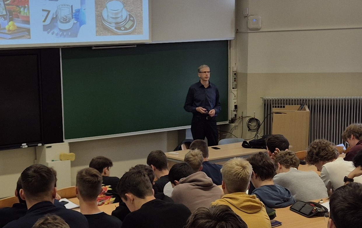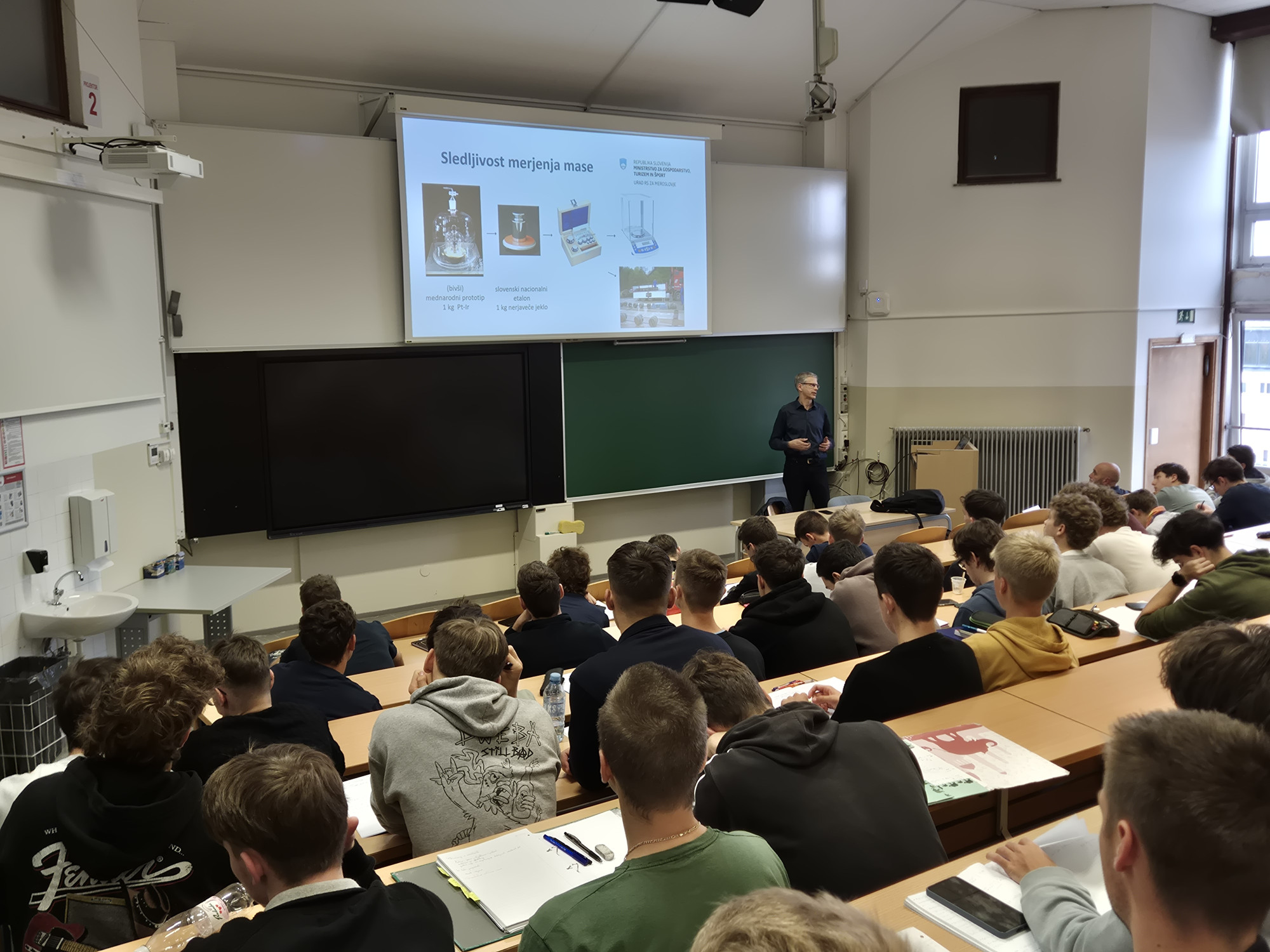 V izredno dinamični in interaktivni predstavitvi je študentom približal področje meroslovja, s posebnim poudarkom na osnovni fizikalni veličini – masi.