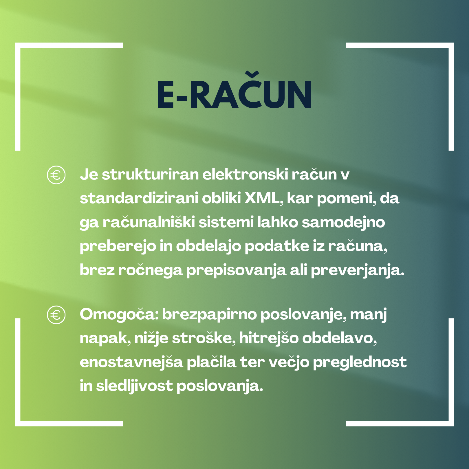 E-račun je račun prihodnosti – pametni dokument, ki omogoča avtomatizacijo poslovnih procesov in s tem sodobno, pregledno in stroškovno učinkovito poslovanje.