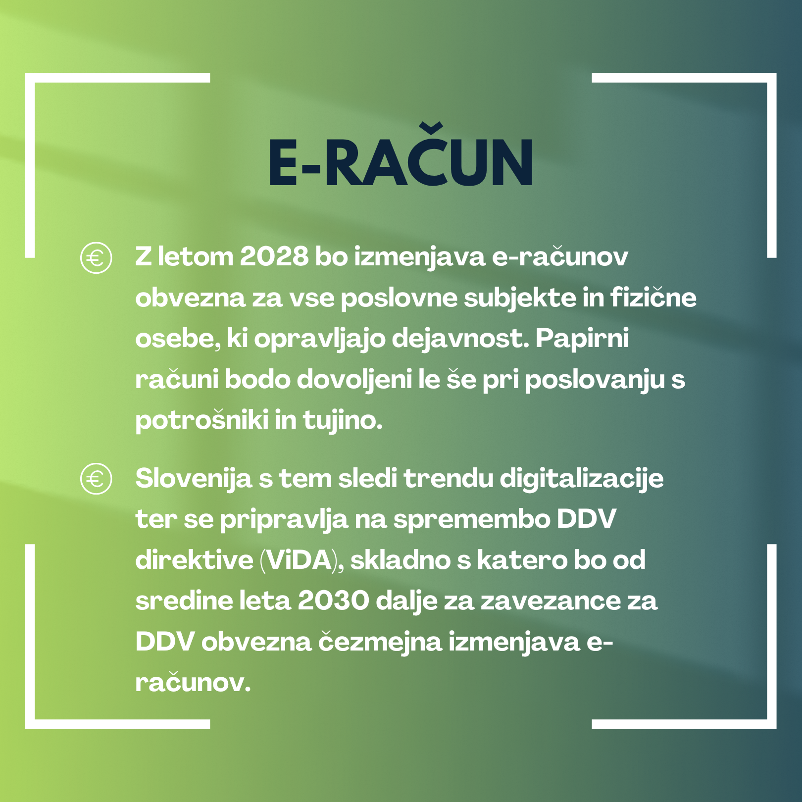 Državni zbor je včeraj sprejel Zakon o izmenjavi elektronskih računov in drugih elektronskih dokumentov, ki bo poenotil poslovanje z računi v Sloveniji. Z letom 2028 bo izmenjava elektronskih računov obvezna za vse poslovne subjekte in fizične osebe, ki opravljajo dejavnost. Papirni računi bodo tako dovoljeni le še pri poslovanju s potrošniki in tujino.