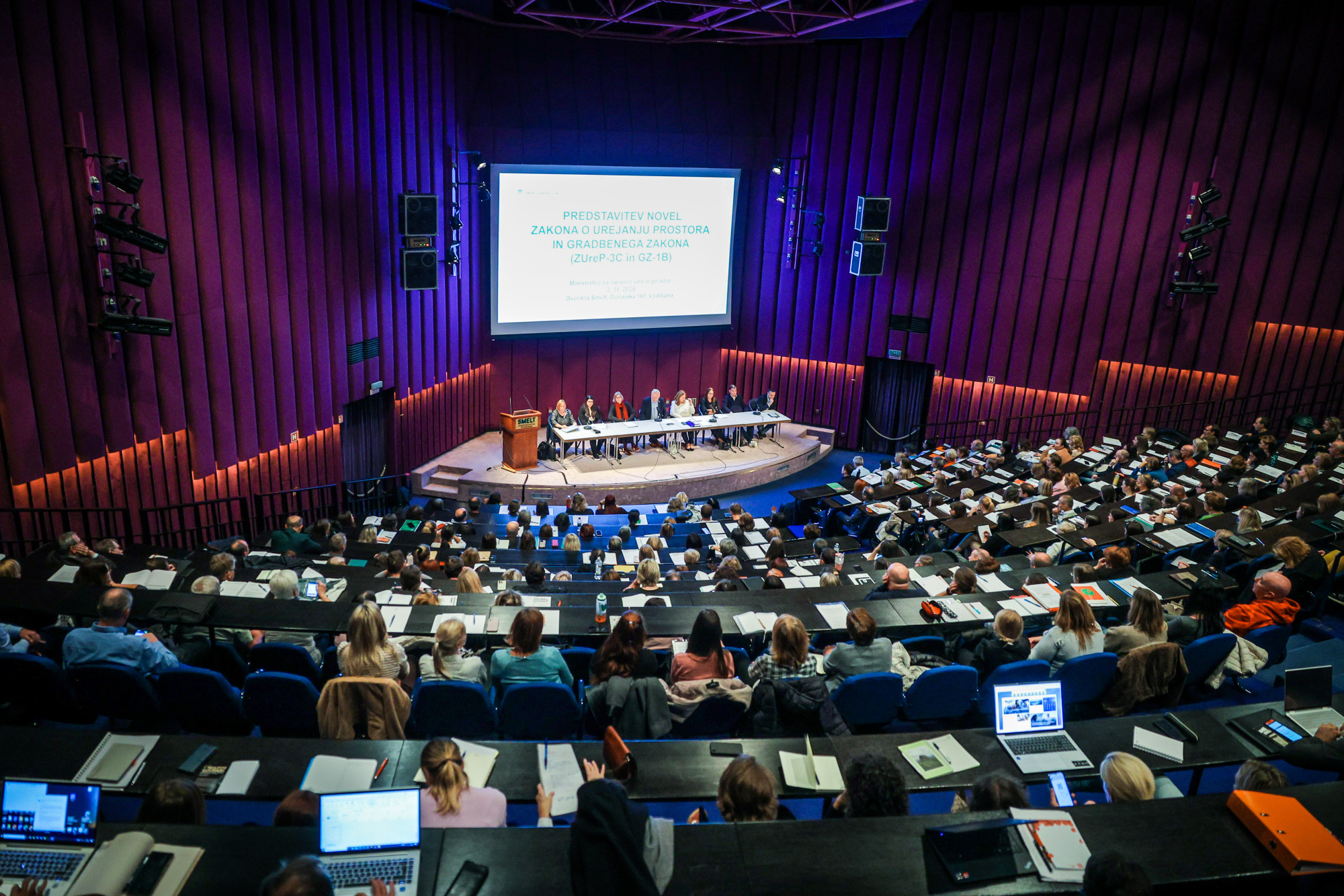 Na posvetu so bile s strani ministra in predstavnikov Direktorata za prostor in graditev na Ministrstvu za naravne vire in prostor predstavljene ključne spremembe zakonov. | Avtor: Daniel novakovič/STA
