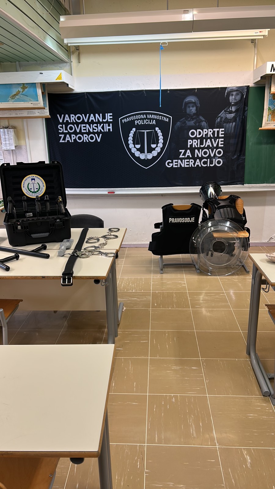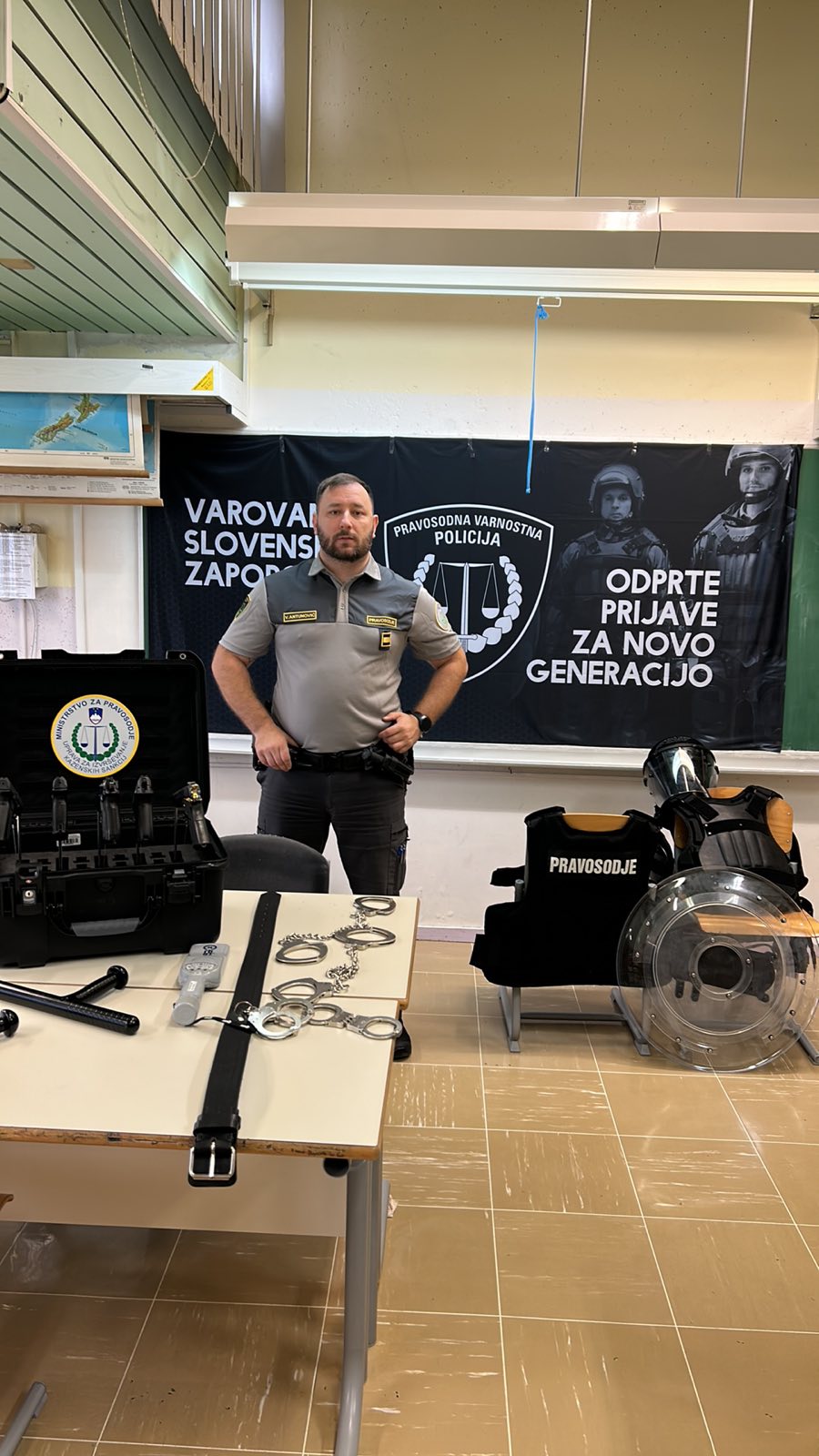 Učenci so se v interaktivni predstavitvi spoznali z raznolikim in zahtevnim delom pravosodnega policista. Spoznali so, kako pomembno je zagotavljanje reda in varnosti v zaporih, spremljanje zaprtih oseb in izvajanje varnostnih postopkov ter sodelovanje z drugimi strokovnimi službami. Predstavnika sta poudarila, da je poklic pravosodnega policista zgrajen na treh temeljnih vrednotah – varnosti, odločnosti in pravičnosti – ter da zahteva visoko stopnjo odgovornosti in pripravljenosti na delo z ljudmi v zahtevnih okoliščinah. Predstavitev je posebej izpostavila pomen fizične in psihološke pripravljenosti, sodelovanja v timu ter stalnega strokovnega razvoja. Poklic pravosodnega policista je bil predstavljen kot dinamičen, odgovoren in karierno raznolik, saj ponuja številne možnosti napredovanja in specializacije znotraj zaporskega sistema.