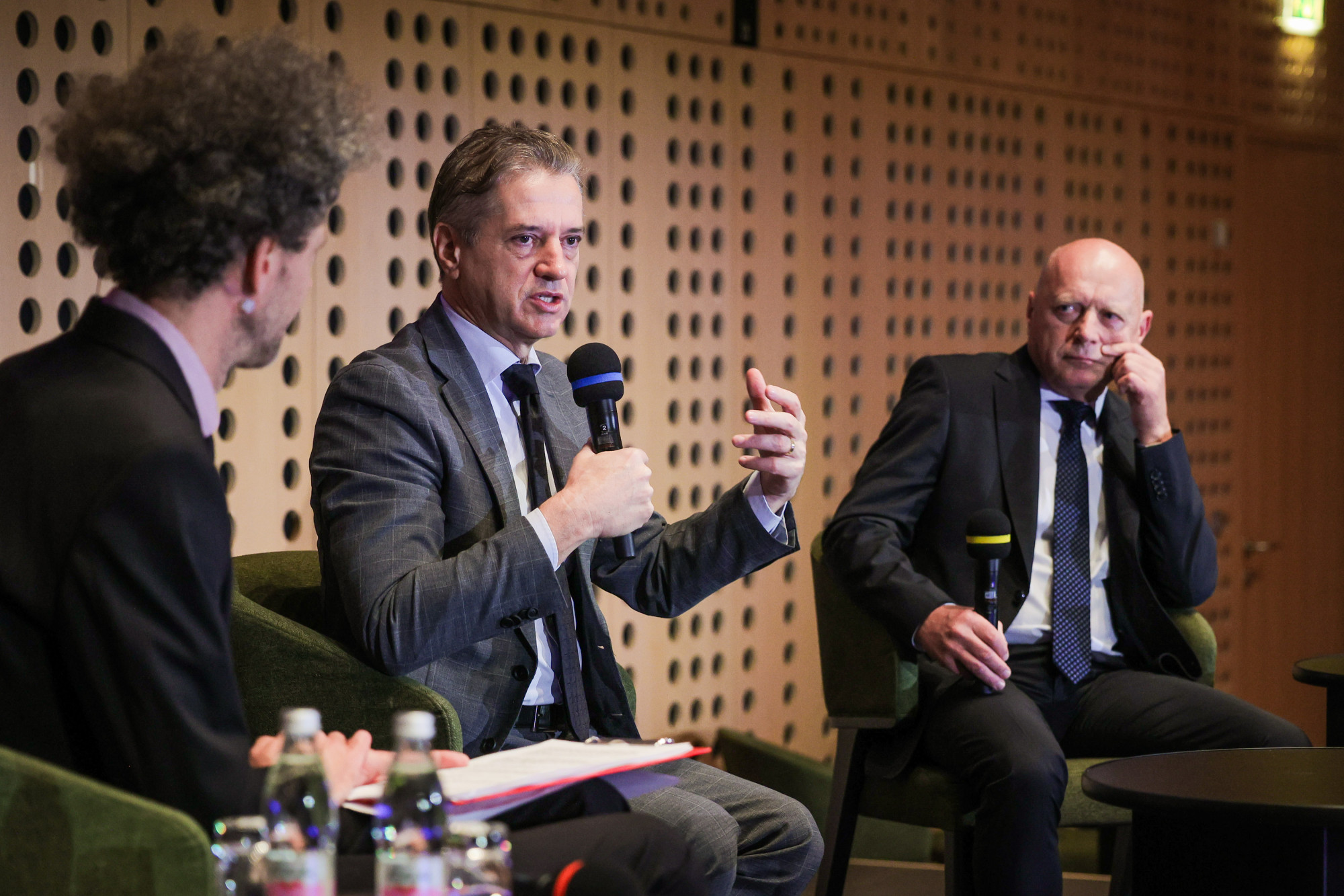 S pogovorom sta konferenco Jutri 2025 odprla predsednik vlade dr. Robert Golob in minister za javno upravo mag. Franc Props. | Avtor: STA
