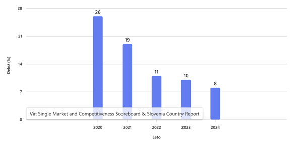 Po podatkih Evropske komisije (v angleščini) je ta delež leta 2024 znašal 8 odstotkov, kar pomeni izrazit padec v primerjavi z letom 2020, ko je po podatkih Evropske komisije znašal kar 26 odstotkov.