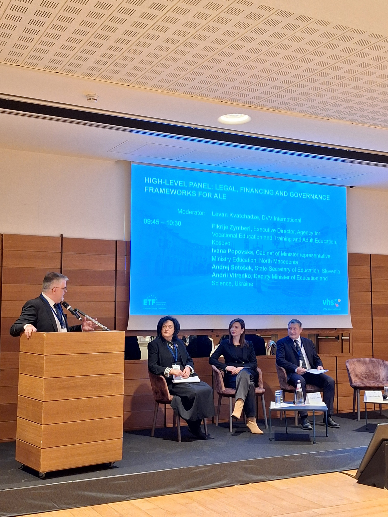 Državni sekretar mag. Andrej Sotošek z Ministrstva za vzgojo in izobraževanje je v okviru dogodka sodeloval v panelni razpravi o pravnih, institucionalnih in upravljavskih strukturah izobraževanja odraslih. Predstavil je pravni okvir ureditve sistema izobraževanja odraslih v Sloveniji in pri tem izpostavil Zakon o izobraževanju odraslih, uveljavitev javne službe na področju izobraževanja odraslih ter strateški dokument Resolucijo o nacionalnem programu izobraževanja odraslih v Republiki Sloveniji za obdobje 2022 – 2030. Poudaril je, da želimo z uresničevanjem ciljev in ukrepov do leta 2030 odpraviti razvojne zaostanke, zlasti na področju ravni pismenosti in temeljnih zmožnosti ter poklicnih zmožnosti odraslega prebivalstva, izobrazbene ravni in vključenosti v vseživljenjsko učenje ter organiziranosti in učinkovitosti upravljanja in urejanja politike izobraževanja odraslih v državi. Poudaril je tudi, da mora Slovenija narediti še nekaj korakov k še boljši ureditvi področja izobraževanja odraslih, kjer je pomembno predvsem stabilno financiranje.