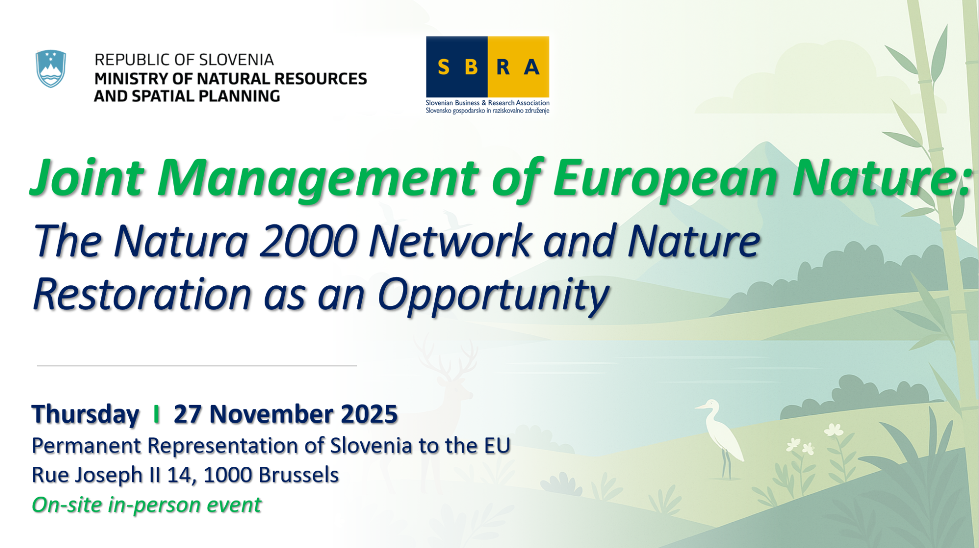 Dogodek, ki ga organizira Ministrstvo za naravne vire in prostor v sodelovanju s Slovenskim gospodarsko-raziskovalnim združenjem (SBRA) iz Bruslja, bo potekal na Stalnem predstavništvu Republike Slovenije pri EU. Zbral bo odločevalce, strokovnjake za politike in izvajalce, ki si prizadevajo soustvarjati prihodnost evropske narave.