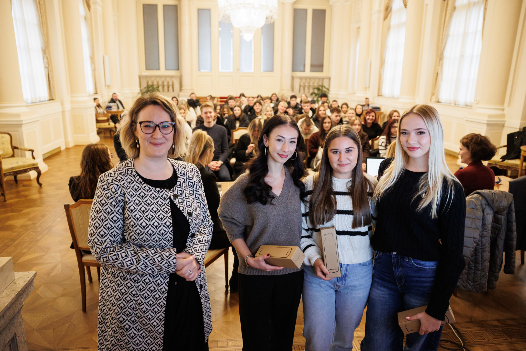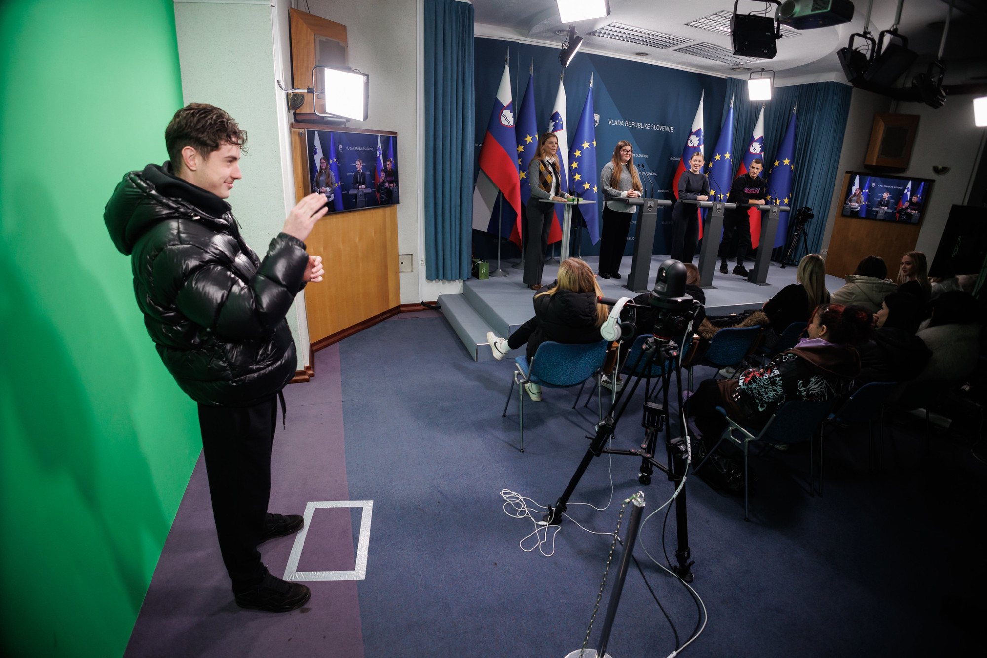 V drugem delu obiska so dijaki spoznali še delo Protokola Republike Slovenije in Urada vlade za komuniciranje. Predstavili smo jim predsedniško palačo in kristalno dvorano, kjer potekajo obiski dijakov, ter novinarsko središče, kjer so vladne novinarske konference. Z dijaki smo izvedli tudi simulacijo vladne novinarske konference, tako da so se lahko preizkusili v vlogi govorcev, novinarjev in tolmača v znakovni jezik.