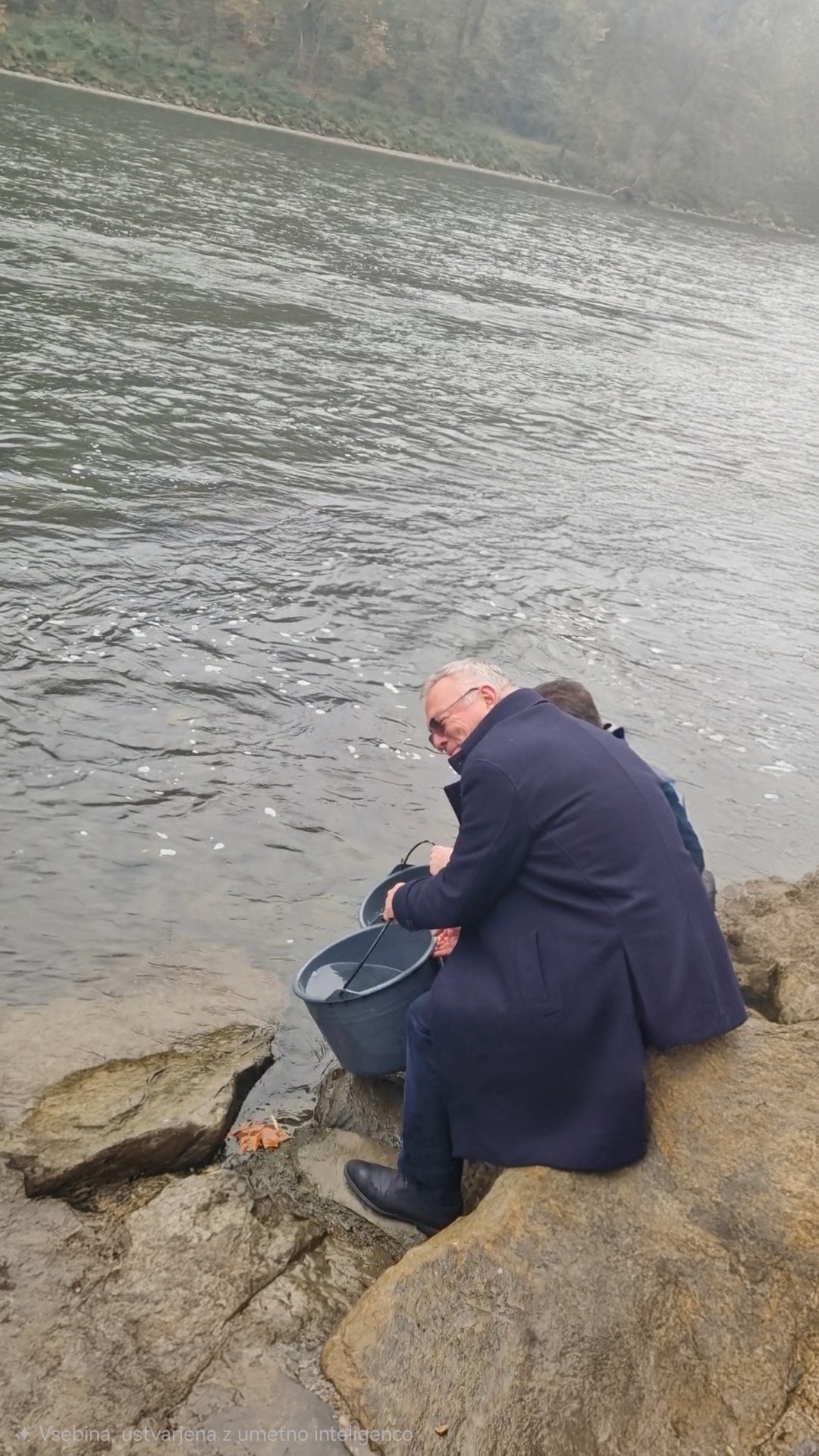 Minister Jože Novak ob simboličnem spustu jesetrov v reko Muro