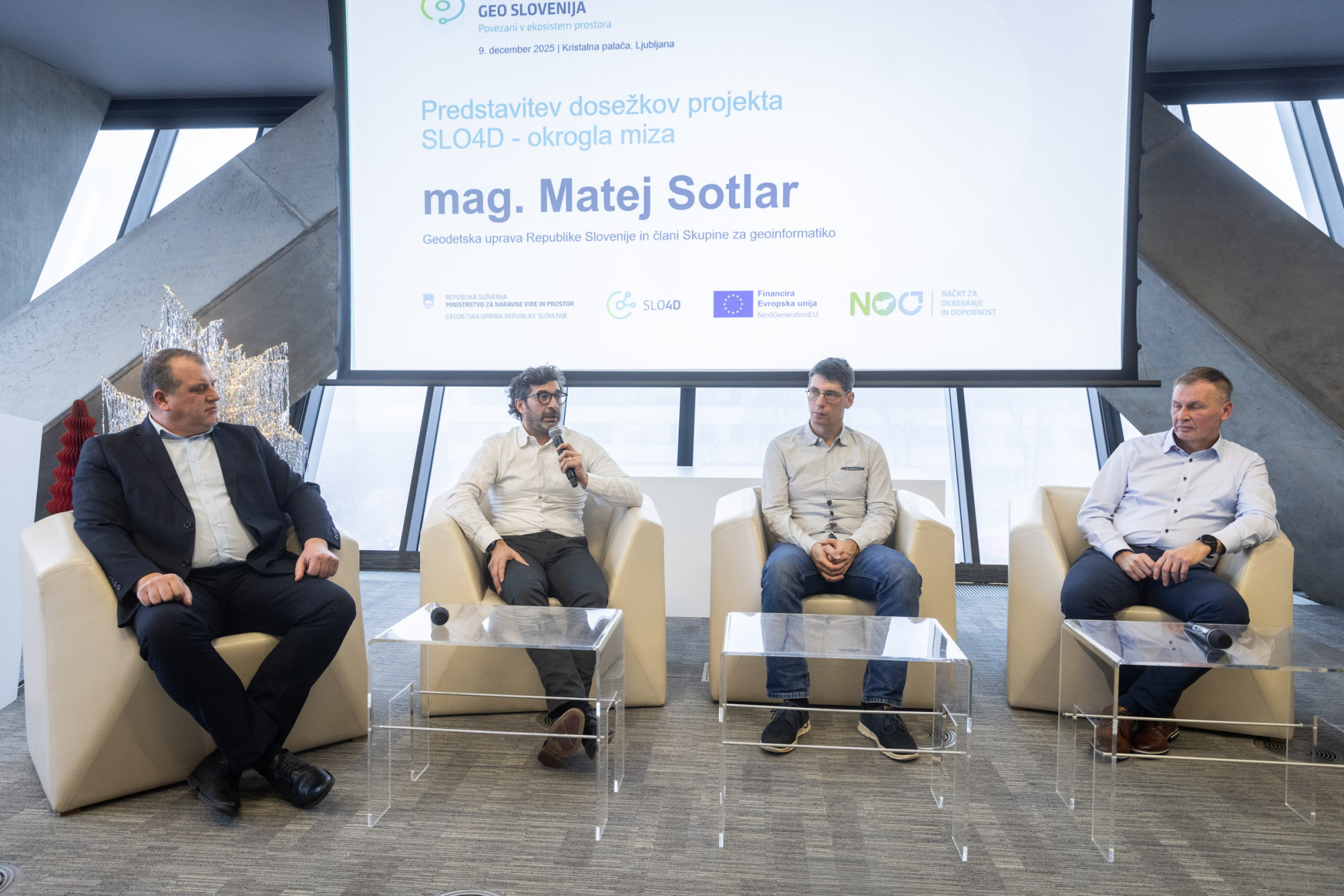 V nadaljevanju je Matej Sotlar skupaj s Skupino za geoinformatiko pri projektu Zeleni slovenski lokacijski okvir predstavil ključne dosežke projekta SLO4D. Predstavil je skupno infrastrukturo prostorskih informacij, kataloge podatkov, storitev in procesov ter primere uporabe, pri katerih je horizontalno povezovanje nepremičnin, prostora, okolja, voda in narave pokazalo konkretne koristi za uporabnike in za državno upravo. SLO4D je bil predstavljen kot prvi veliki korak k nastanku skupnosti Geo Slovenija.