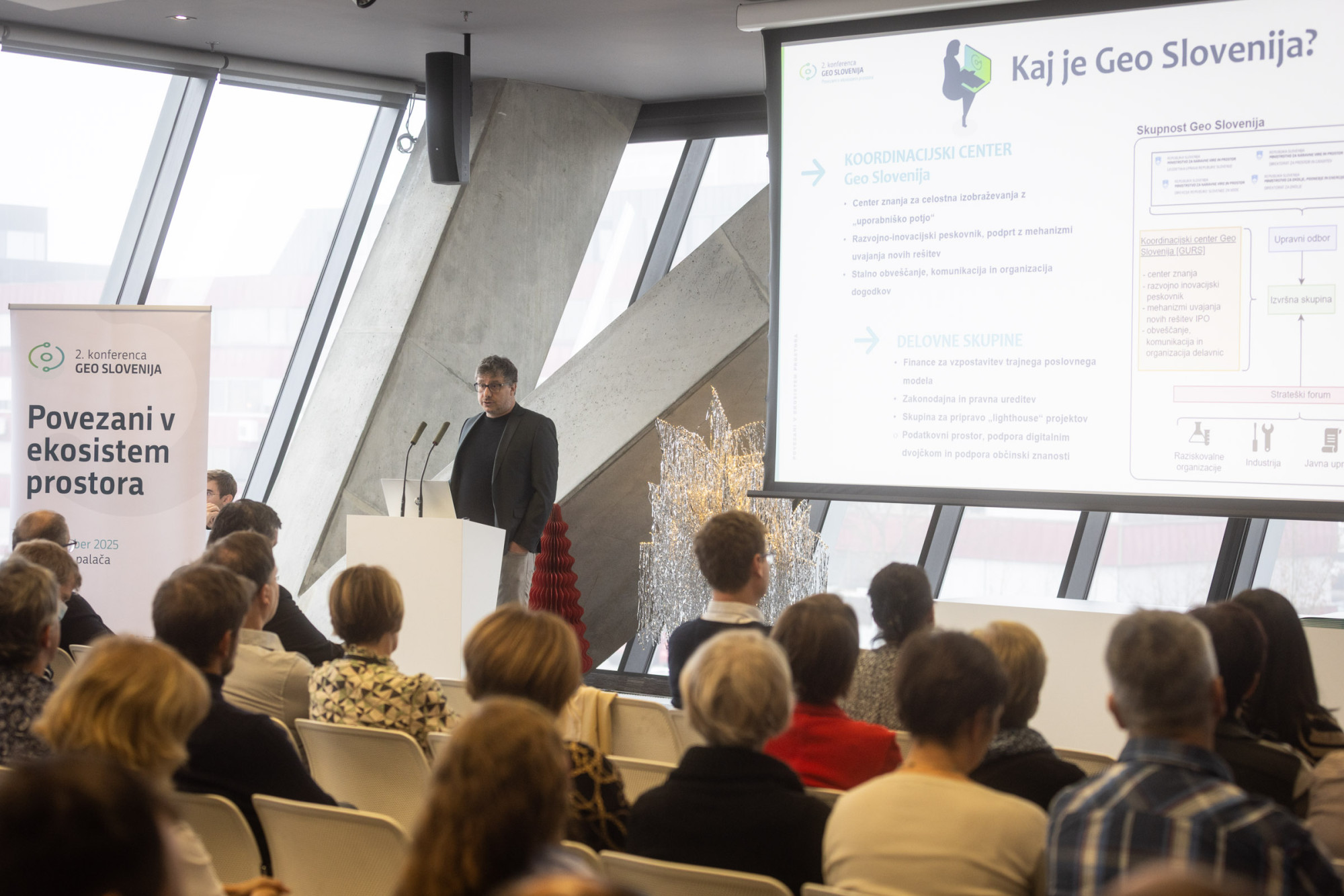 Po odmoru za kavo in mreženje se je konferenca preusmerila v tematski del, posvečen prihodnjemu razvoju Geo Slovenije. Matjaž Grilc je v predavanju »Geo Slovenija od infrastrukture k živemu ekosistemu prostora« pojasnil premik od razumevanja Geo Slovenije kot tehnične infrastrukture k razumevanju kot skupnosti, ki povezuje podatke, storitve, procese in strokovnjake. Predstavil je kataloge gradnikov, podatkovnih zbirk, informacijskih rešitev in spletnih storitev ter vlogo novega portala Geo Slovenija kot centralne točke za prostorske informacije.