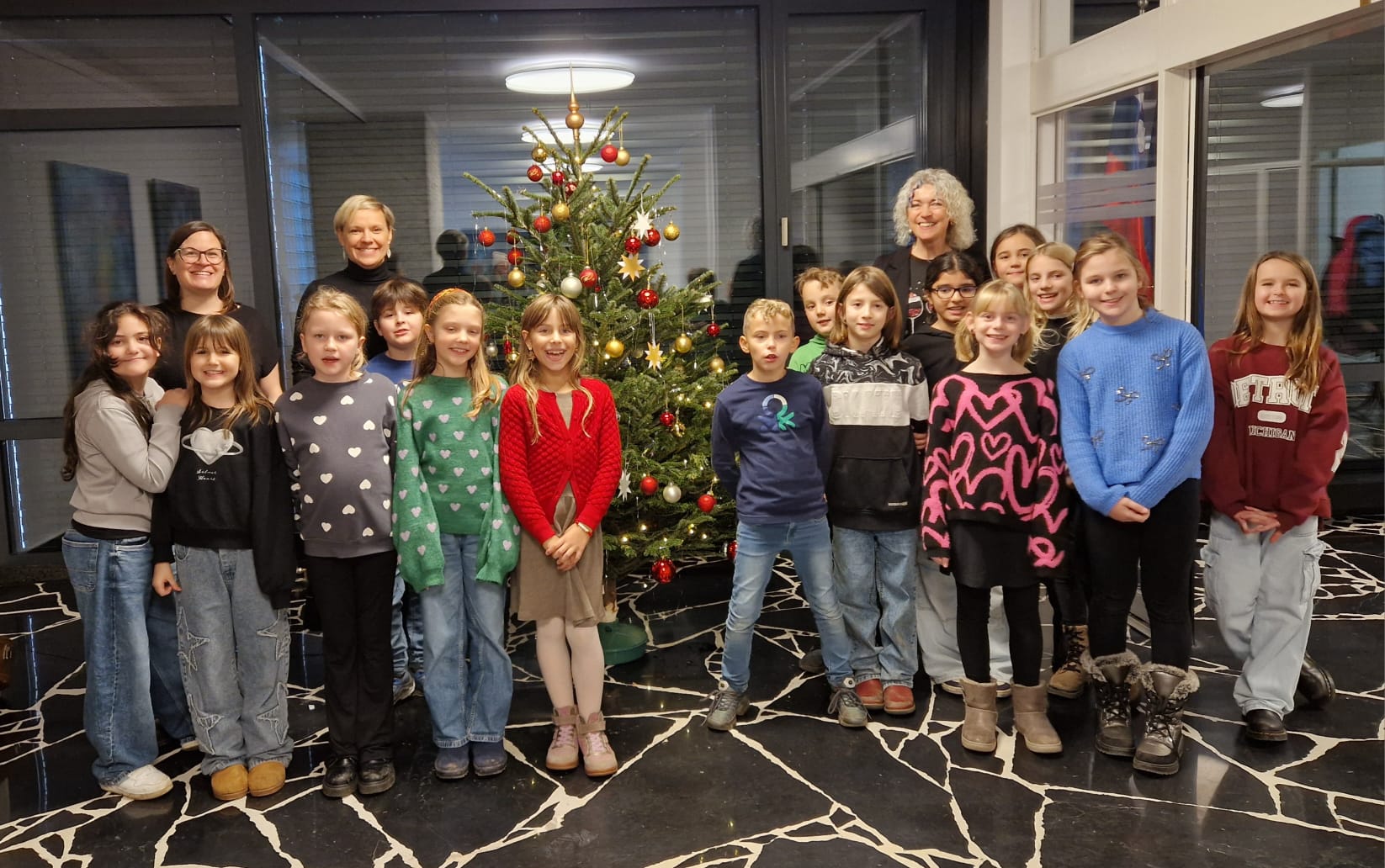Otroci Mohorjeve ljudske šole v Celovcu so tudi letos, v torek, 9. decembra, obiskali KCE in skupaj z zaposlenimi KCE okrasili božično drevo. Skupino otrok sta spremljali ravnateljica šole Tatjana Tolmaier ter vodja varstva Simona Mandl.
