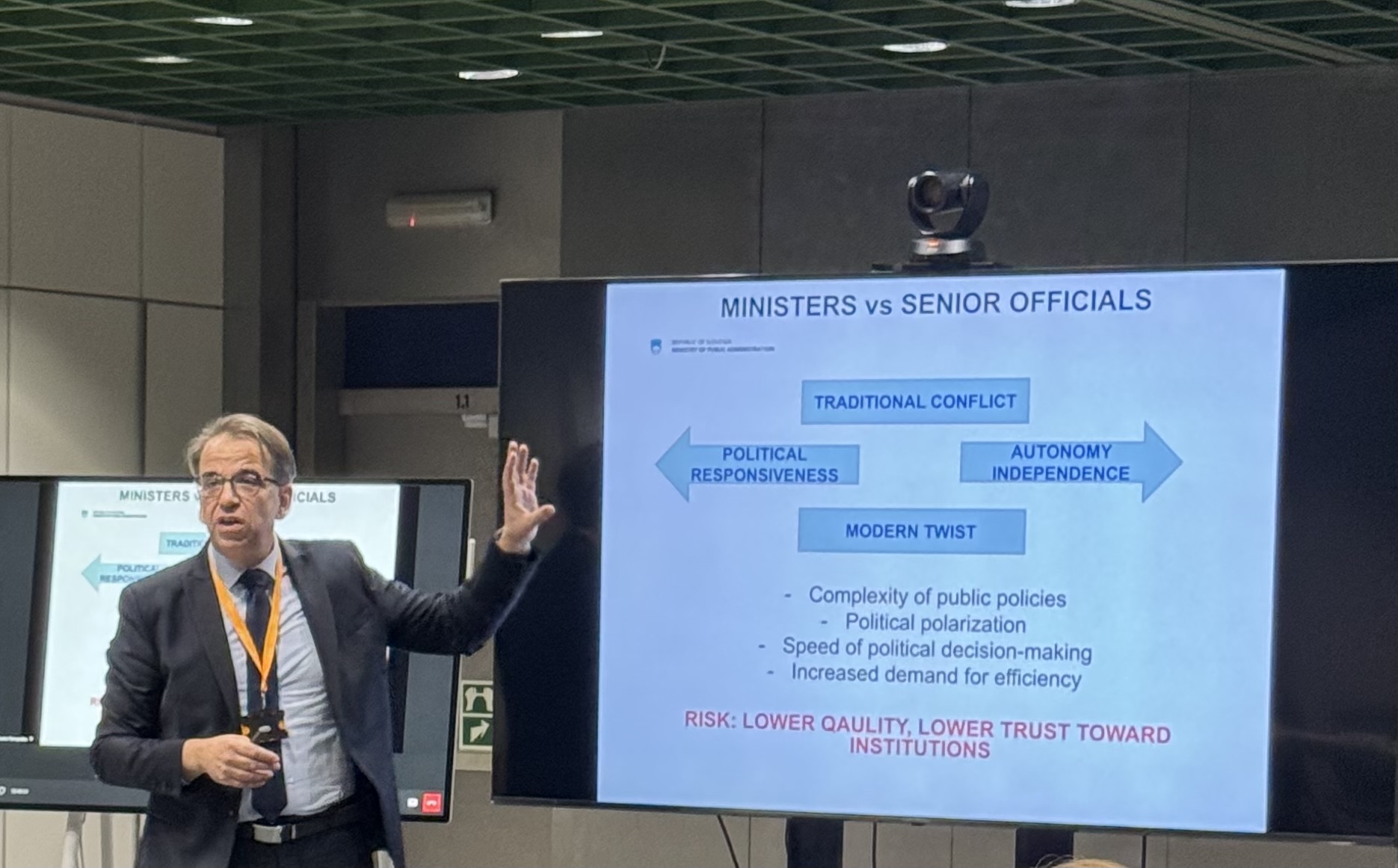 Generalni direktor Peter Pogačar je v svoji predstavitvi izpostavil razmerja med vlogo političnih odločevalcev in uradništva v Sloveniji ter predstavil dileme in priložnosti za izboljšave obstoječega sistema.