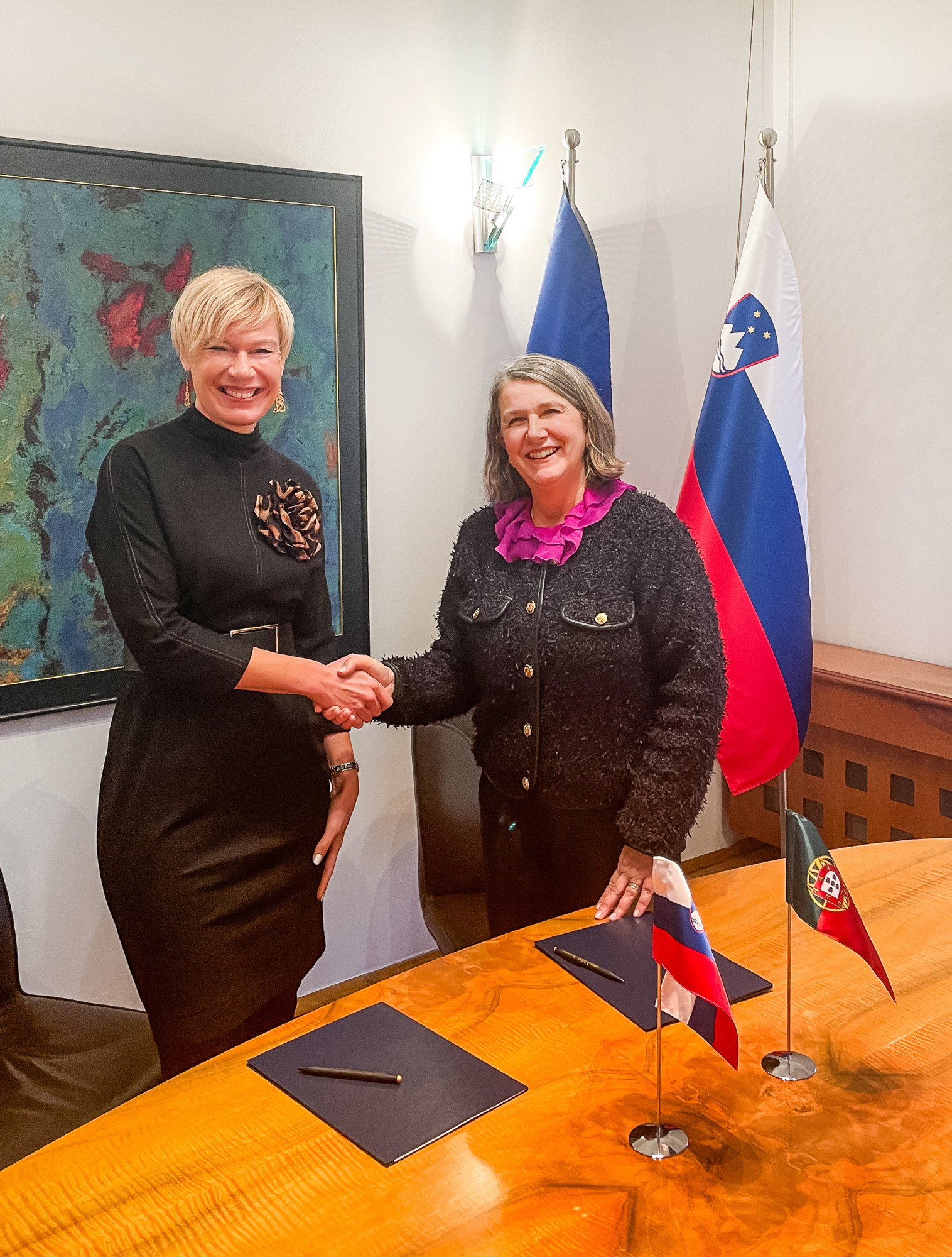 V okviru srečanja sta direktorica slovenskega urada mag. Karin Žvokelj in predsednica upravnega sveta portugalskega inštituta Ana Bandeira podpisali načrt dela za leto 2026, ki temelji na memorandumu o sodelovanju, sklenjenem marca 2024.