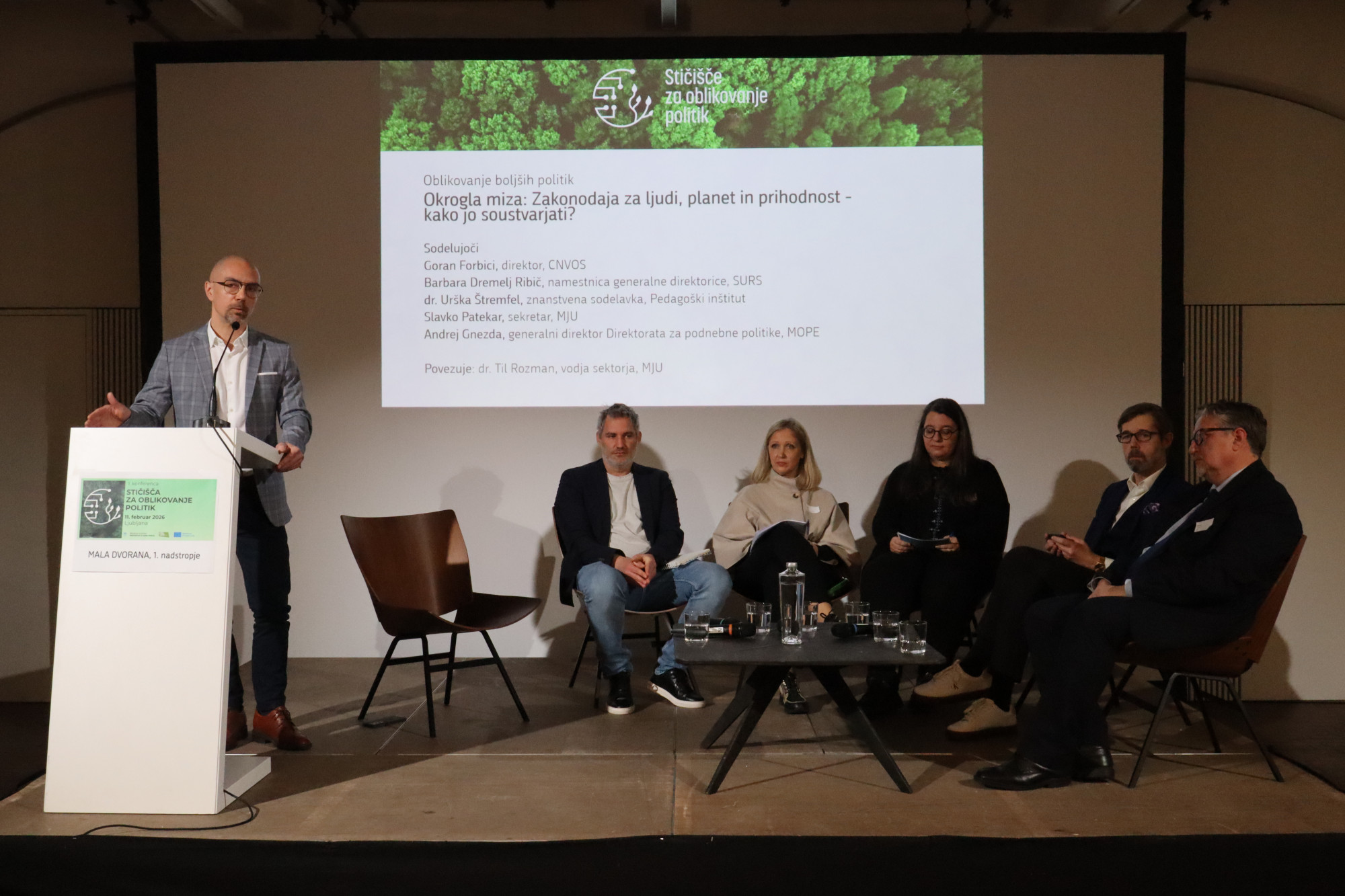 V nadaljevanju konference je bila okrogla miza »Zakonodaja za ljudi, planet in prihodnost – kako jo soustvarjati?«, ki jo je moderiral dr. Til Rozman, vodja sektorja na Ministrstvu za javno upravo. V razpravi so sodelovali Goran Forbici, direktor CNVOS, Barbara Dremelj Ribič, namestnica generalne direktorice Statističnega urada Republike Slovenije (SURS), dr. Urška Štremfel s Pedagoškega inštituta, Slavko Patekar, sekretar na Ministrstvu za javno upravo, ter Andrej Gnezda, generalni direktor Direktorata za podnebne politike na Ministrstvu za okolje, podnebje in energijo. Razprava je bila usmerjena v vprašanje, kako zakonodajo oblikovati na način, ki bo bolj vključujoč, trajnosten in dolgoročno naravnan.