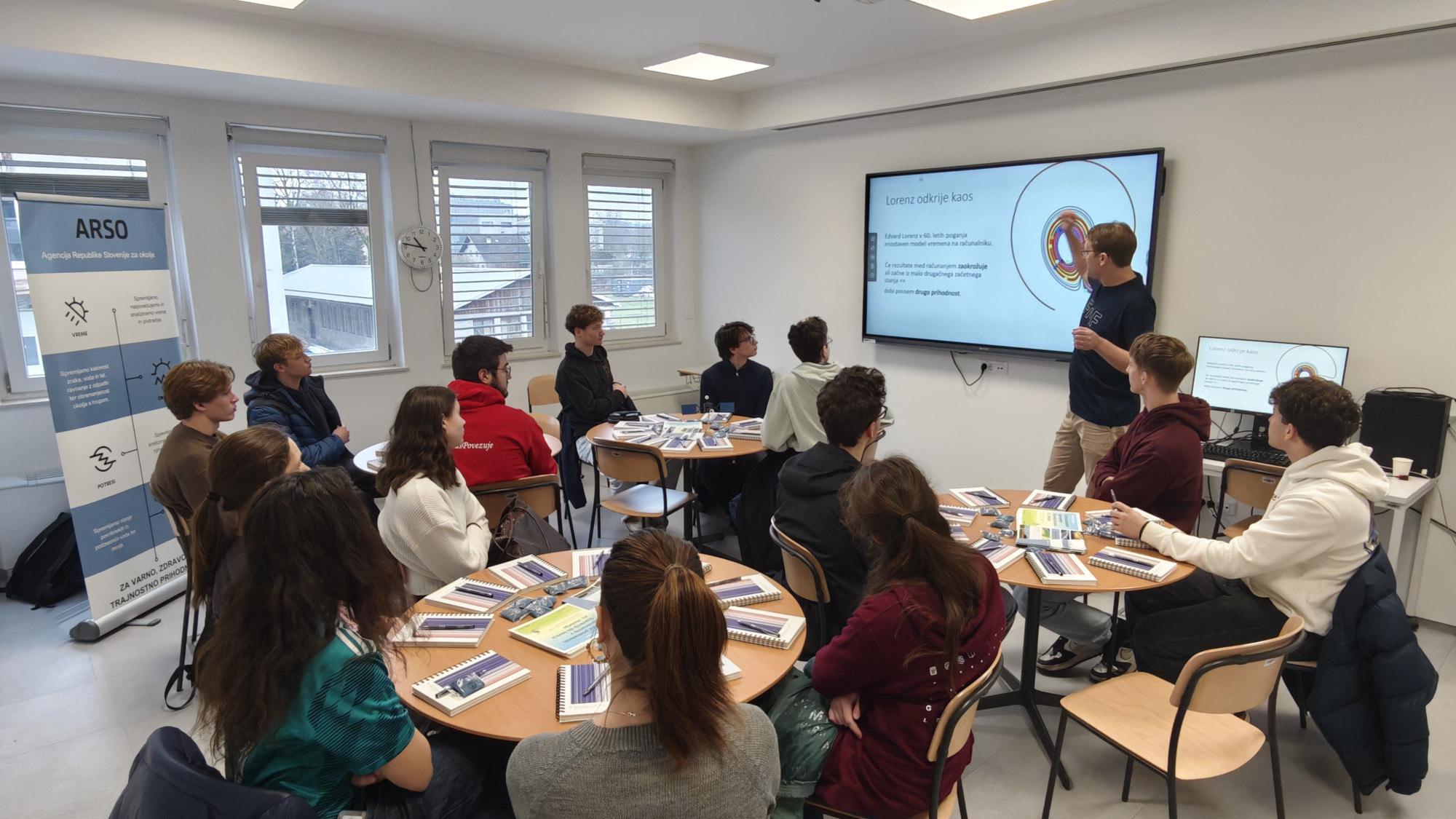 Dr. Benedikt Strajnar je s predstavitvijo o nastanku vremenske napovedi pritegnil številne dijake. Na kratko je predstavil meteorološke modele, skupinske napovedi, uporabnost vremenske napovedi, zaposlitvene možnosti in vpliv umetne inteligence v meteorologiji. Dijaki so lahko vpliv kaosa v vremenski napovedi spoznavali v animaciji Lorenzovega metulja, prav tako pa so lahko poganjali vremensko napoved trenutno najboljšega vremenskega modela, ki temelji na umetni inteligenci (angleško Artificial Intelligence/Integrated Forecasting System - AIFS).