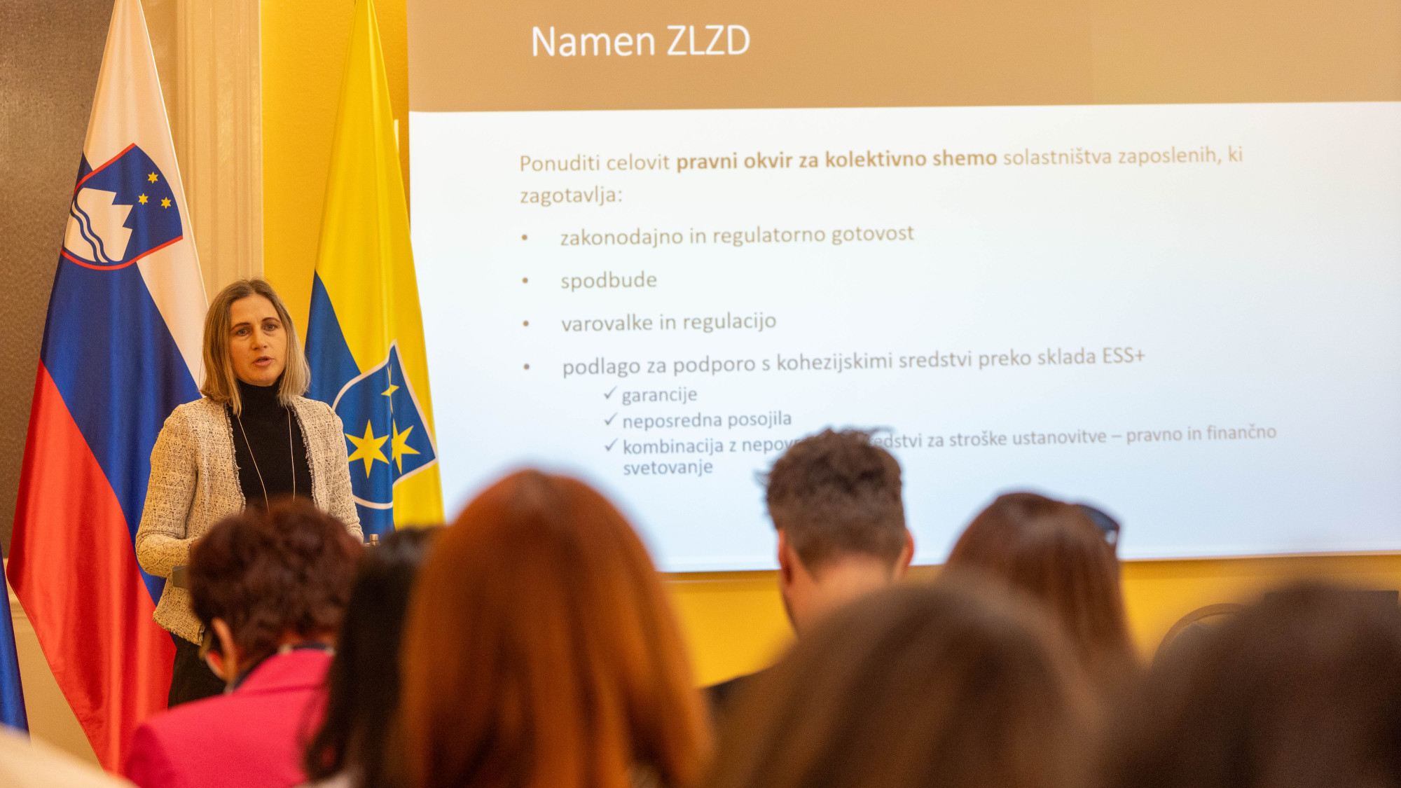 Tilen Božič iz Inštituta za ekonomsko demokracijo je v svoji predstavitvi celovito razdelal slovenski model ESOP in njegovo umeščenost v novi Zakon o lastniški zadrugi delavcev. Mag. Leja Drofenik Štibelj, vodja Službe za ekonomsko demokracijo na Ministrstvu za solidarno prihodnost, pa je predstavila ključne lastnosti zakona. Predavatelja sta udeležencem podala odgovore na številna vprašanja glede davčnih spodbud, načina financiranja odkupov ter razlik med novim zakonom in klasično udeležbo delavcev pri dobičku.