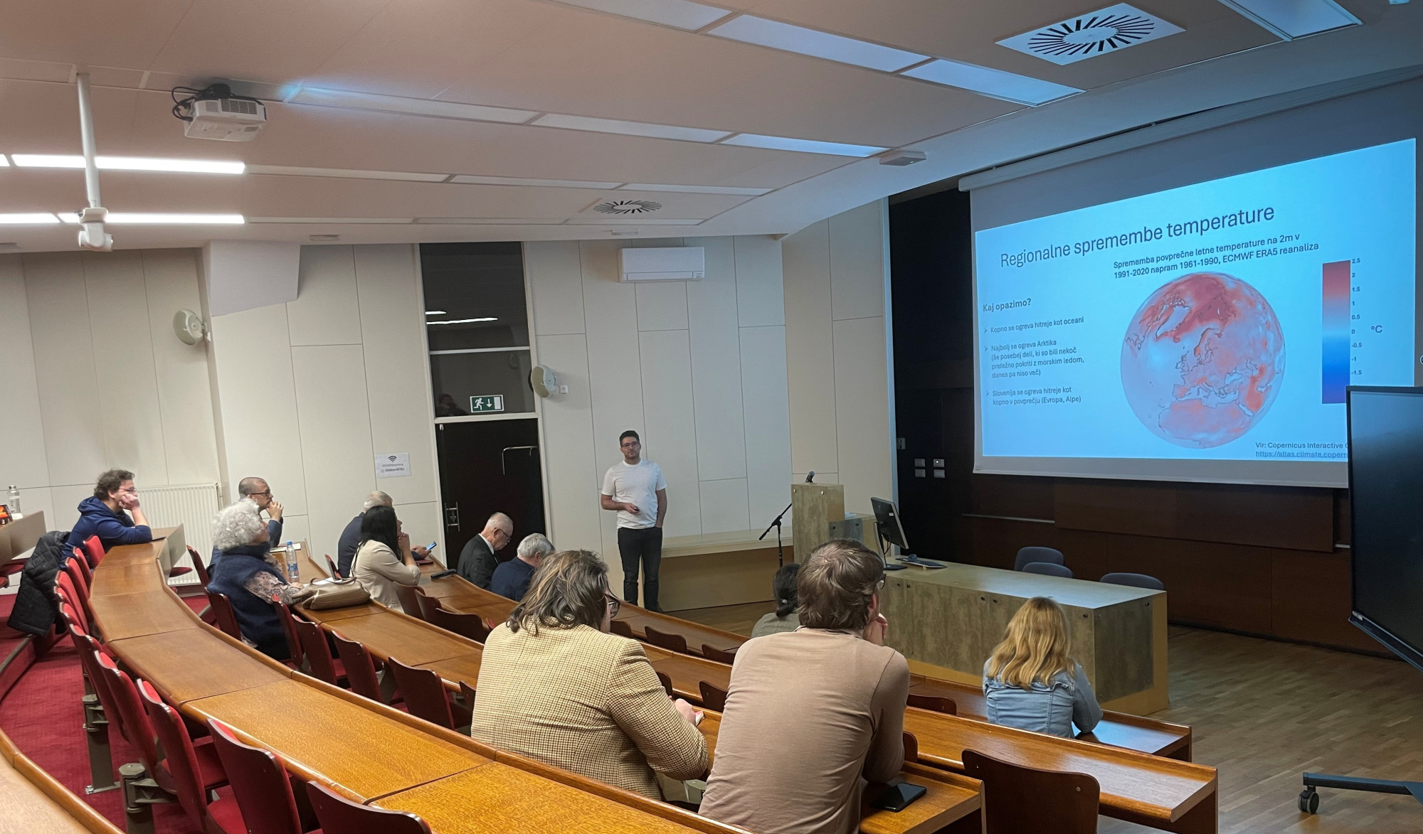 Predsednik Podnebnega sveta doc. dr. Žiga Zaplotnik je v uvodnem predavanju poudaril, da se Slovenija segreva hitreje od svetovnega povprečja in hitreje od večine Evrope, kar potrjujejo tako instrumentalne meritve kot regionalne podnebne analize. Povprečna letna temperatura v Sloveniji se je v zadnjih desetletjih izrazito zvišala, podnebni pasovi pa so se pomaknili za približno 400 metrov nadmorske višine. Pomlad v Sloveniji nastopi približno dva tedna prej, jesen pa se zaključi kasneje, kar ima pomembne posledice za naravne ekosisteme, kmetijstvo in upravljanje prostora. Predavanje je predstavilo tudi znanstvene dokaze o človeškem vplivu na podnebne spremembe, med drugim naraščajoče koncentracije CO₂, spremembe izotopskih razmerij ogljika in paleoklimatske podatke iz ledenih vrtin, ki kažejo, da je današnja hitrost naraščanja koncentracije CO₂ bistveno večja kot kadarkoli v zadnjih osemsto tisoč letih.