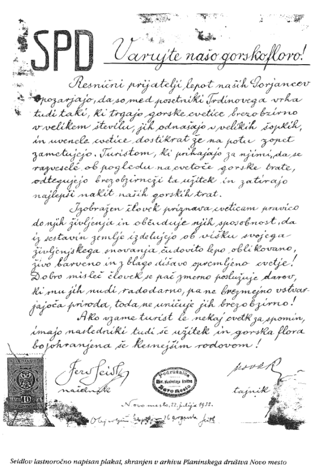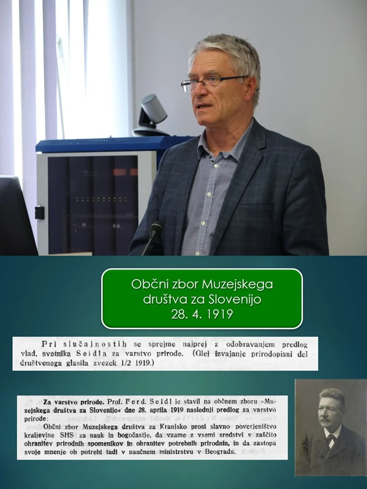 Naravovarstvenik dr. Peter Skoberne pa je predstavil Seidlove pobude, ki so vodile v pripravo Spomenice – prvega celovitega naravovarstvenega programa v slovenskem prostoru. Seidl je pospeševal je zaščito gozdov na Gorjancih, dosegel zaščito izvira Gospodična in prispeval k uveljavitvi imena Trdinov vrh.