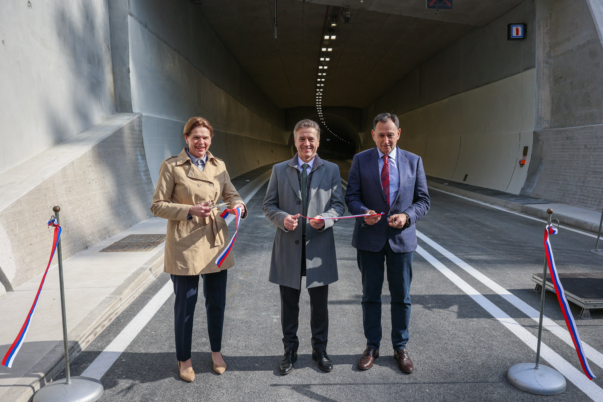 Predsednik vlade Robert Golob, ministrica za infrastrukturo Alenka Bratušek in predsednik uprave DARS Andrej Ribič na slovesnosti ob predaji prometu prvega sklopa severnega dela tretje razvojne osi - H – Konovo. | Avtor: Daniel Novakovič, STA