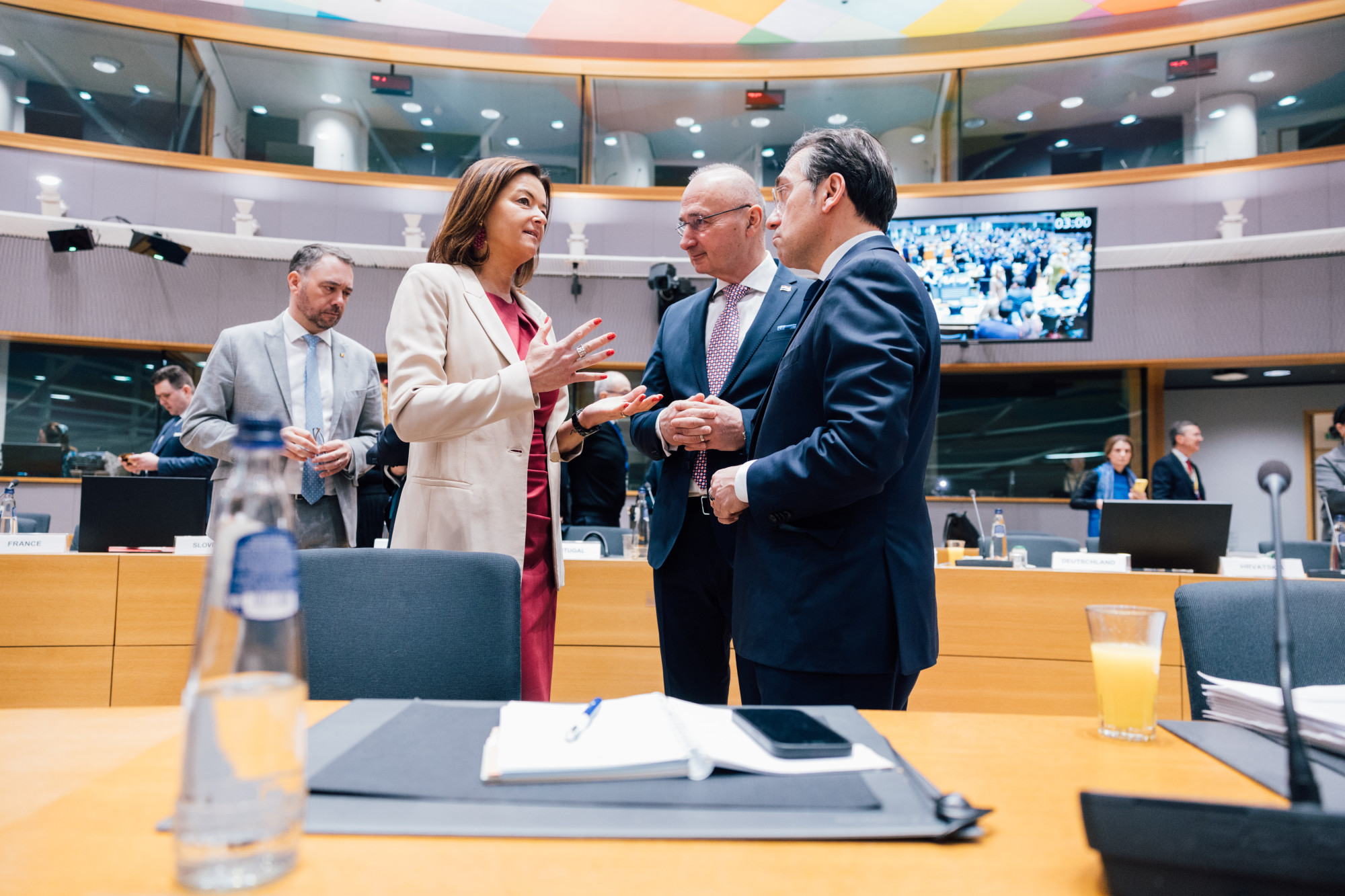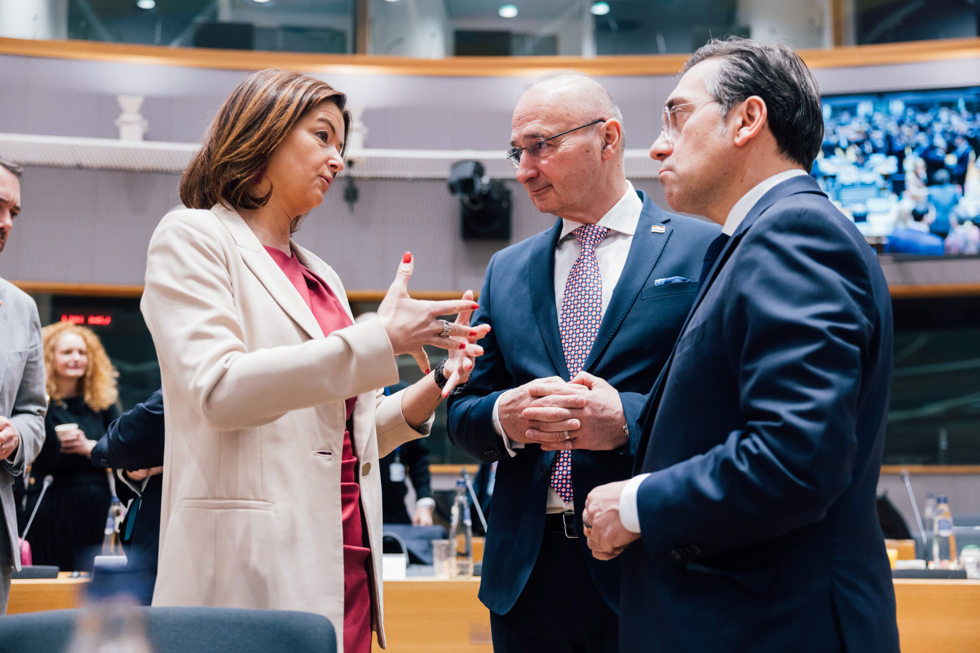 Pred začetkom zasedanja v Bruslju so ministri opravili prvo neformalno razpravo o pripravi nove evropske varnostne strategije, katere cilj je okrepiti sposobnost EU, da prevzame večjo odgovornost za svojo varnost ter zmanjšati varnostne in gospodarske odvisnosti. V zvezi s tem je Fajonova povedala, da bo EU močna samo, če bo temeljila na spoštovanju mednarodnega prava in Ustanovne listine OZN: »Uporaba moči in neavtorizirana uporaba sile ne smeta postati naša nova normalnost.« Na primeru sodnikov Mednarodnega kazenskega sodišča, ki so pod vplivom ameriških sankcij, je pokazala, kaj pomeni tako imenovani načelni pragmatizem, ki ga danes mnogi zagovarjajo, v praksi in poudarila: »Ko gre za teptanje mednarodnega prava in človekovih pravic, ne smemo biti tiho.«