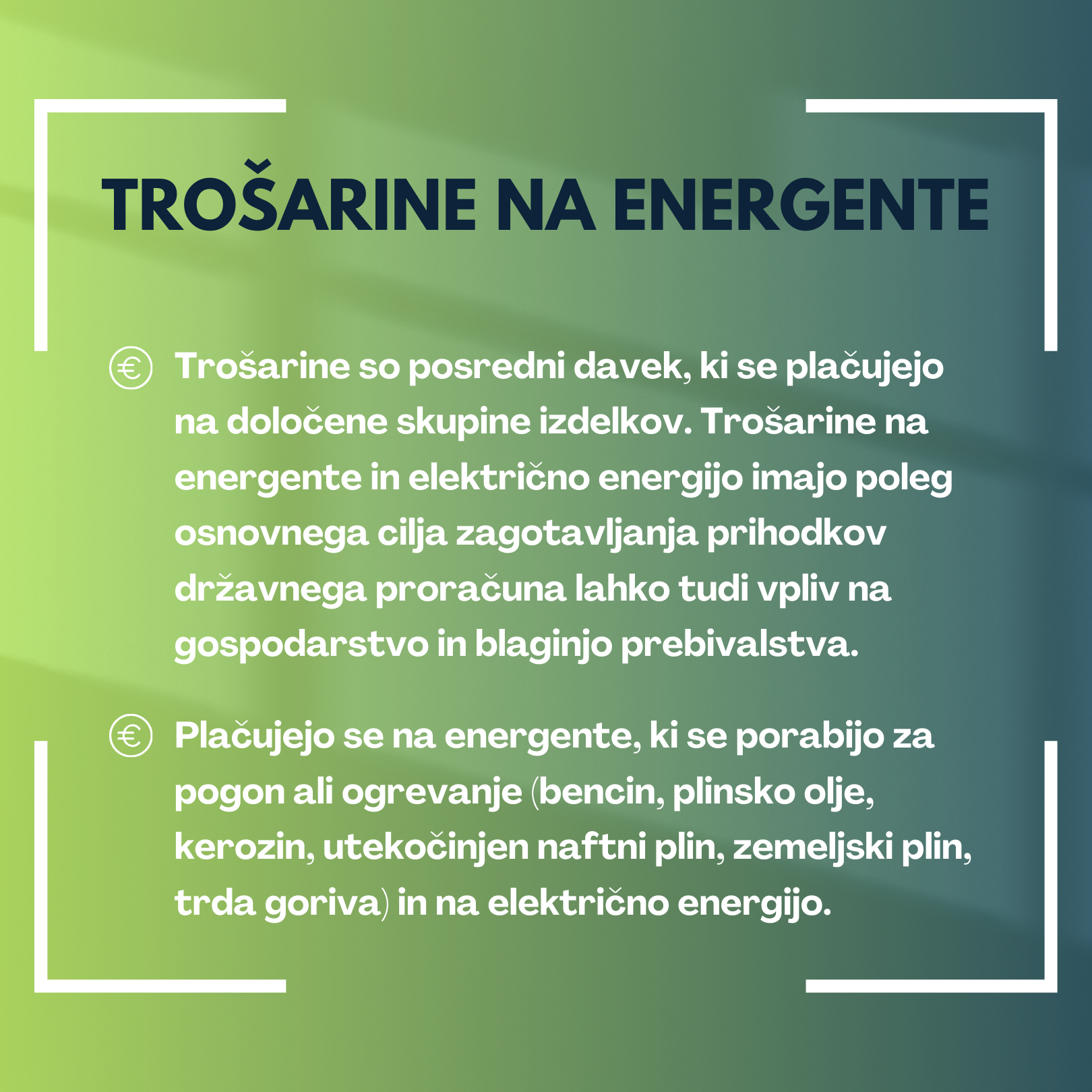 Trošarine so posredni davek, ki se plačujejo na določene skupine izdelkov, tako imenovane trošarinske izdelke. Trošarina se plačuje na energente, ki se uporabljajo za pogon ali ogrevanje (bencin, plinsko olje, kerozin, utekočinjen naftni plin, zemeljski plin, trda goriva) in na električno energijo.