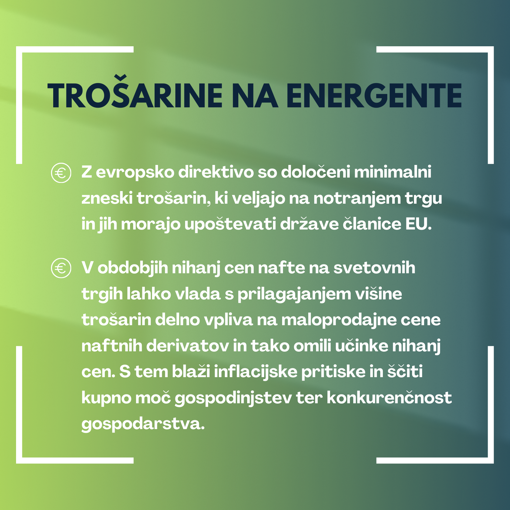 Pri tem je trošarinska politika vpeta v širši evropski pravni okvir in harmonizirana z evropsko direktivo, ki s skupnimi pravili EU glede obdavčitve energentov in električne energije ter z določenimi minimalnimi zneski trošarin zagotavlja nemoteno delovanje skupnega trga in preprečuje izkrivljanje konkurence. Minimalni zneski trošarin so določeni specifično za posamezne vrste energentov glede na njihov namen uporabe – kot pogonsko gorivo, za ogrevanje, za poslovni in neposlovni namen ter za posamezne sektorje gospodarstva. Znotraj okvirja evropske direktive države članice pri določanju višine trošarin ohranjajo avtonomijo, ki jo lahko aktivno izkoriščajo kot regulatorni instrument.