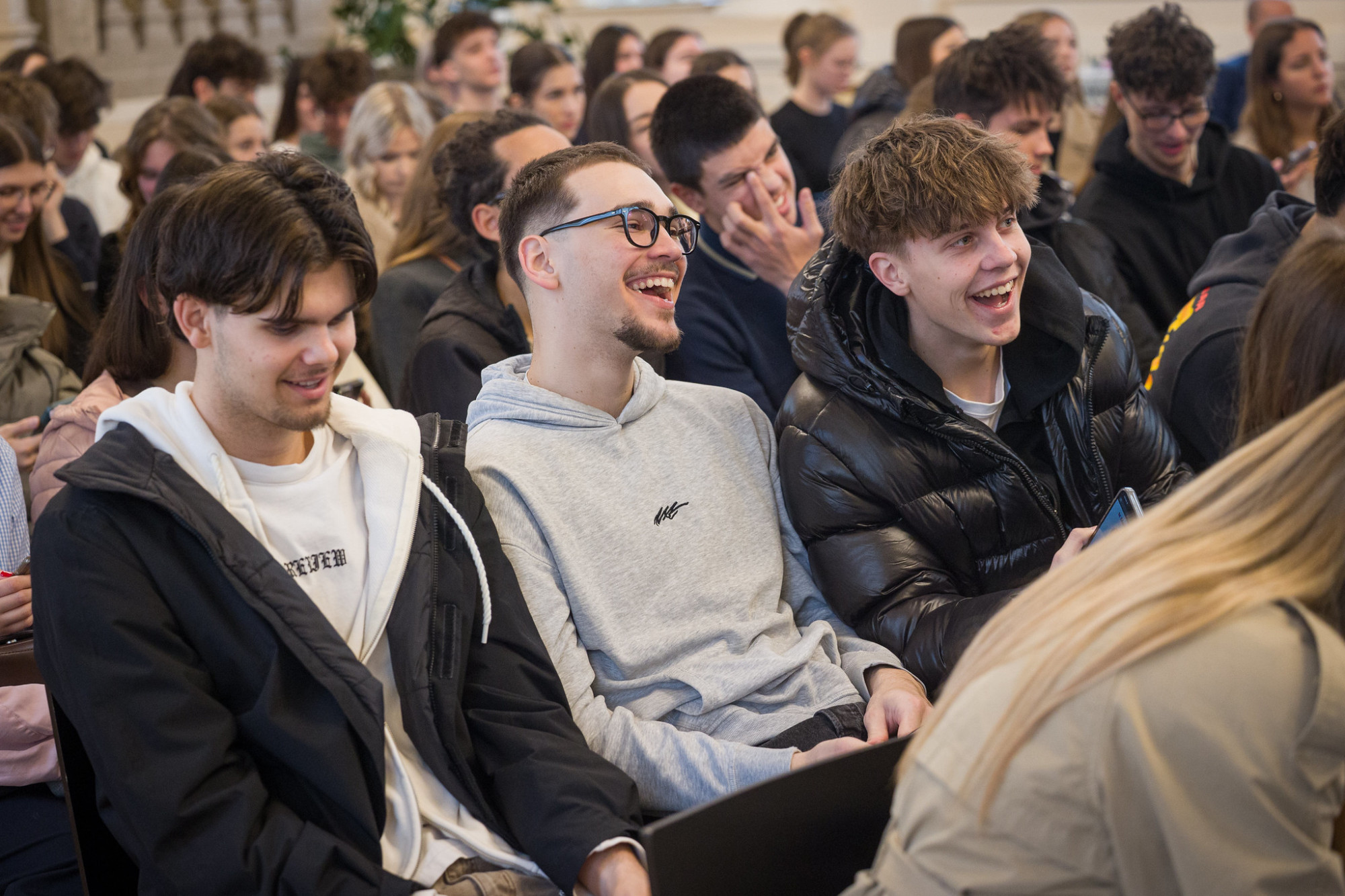 Obisk smo začeli z ogledom predstavitvenega videa o vladi, nato pa s kvizom preverili, kako pozorno so ga dijaki spremljali in kako dobro že poznajo delovanje države. Pri večini vprašanj so se odlično odrezali, nekoliko več izzivov jim je povzročilo vprašanje o strukturi javne porabe. Večina je menila, da država največ sredstev namenja za plače javnih uslužbencev, in jih je presenetilo, da največji delež javnih izdatkov predstavljajo pokojnine.