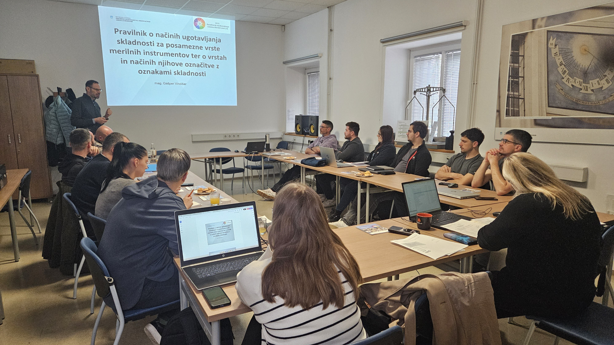 Program se je začel z uvodnim pozdravom mag. Mateja Gruma, vodje sektorja za fizikalna merjenja. Sledila je predstavitev Modula 1 in meroslovnega sistema, ki jo je pripravila mag. Dominika Rozoničnik. V nadaljevanju je mag. Gašper Vindišar predstavil Pravilnik o načinih ugotavljanja skladnosti merilnih instrumentov ter Pravilnik o postopku overitve meril, Simona Selič pa je predstavila navodilo o poslovanju z overitvenimi oznakami.