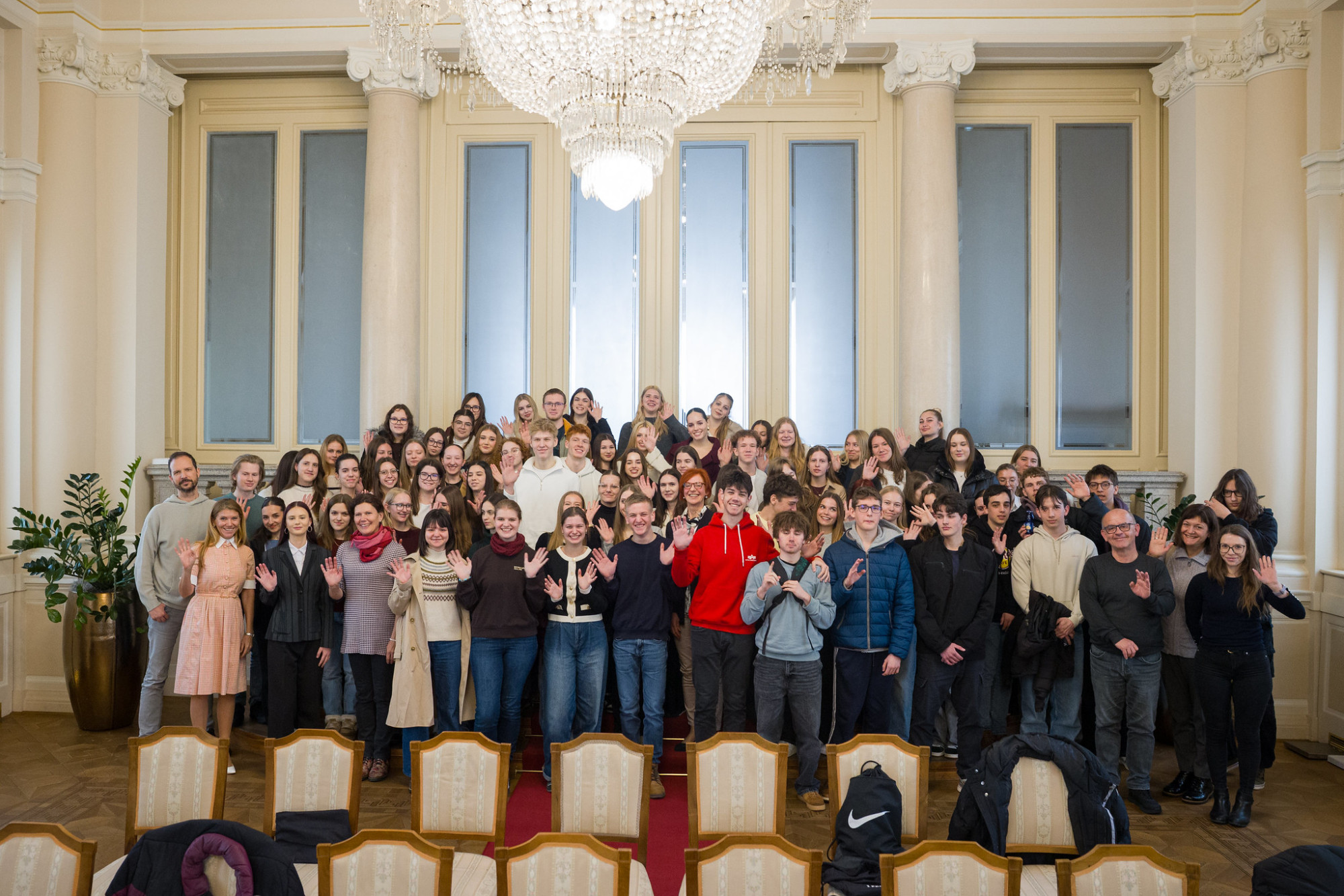 Dijaki in dijakinje Gimnazije Novo mesto v kristalni dvorani Predsedniške palače. | Avtor: UKOM