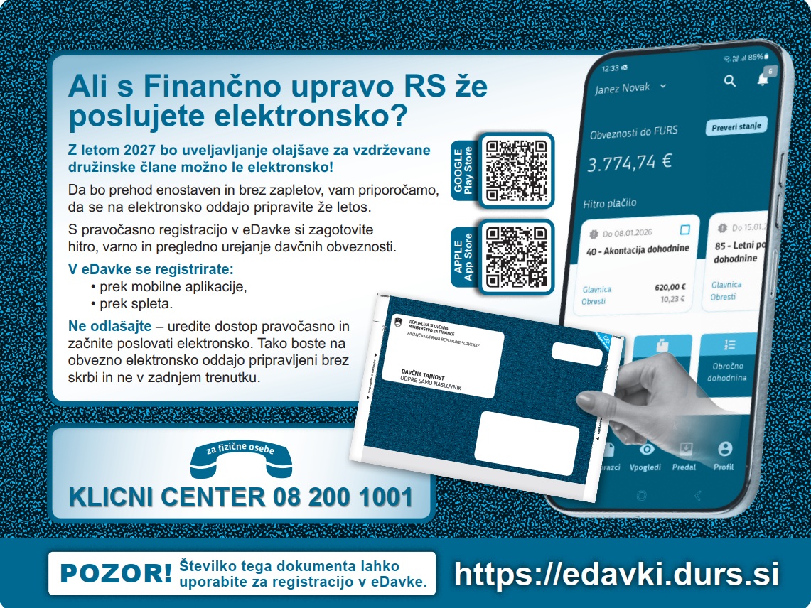 Finančna uprava je v prvem svežnju z datumom odpreme 31. marec 2026 poslala 991.504 informativnih izračunov dohodnine za leto 2025. Zavezanci jih lahko pričakujejo v prvih dneh aprila. Tisti zavezanci, ki so vključeni v sistem eVročanja, bodo informativne izračune dohodnine prejeli prek portala eDavki.