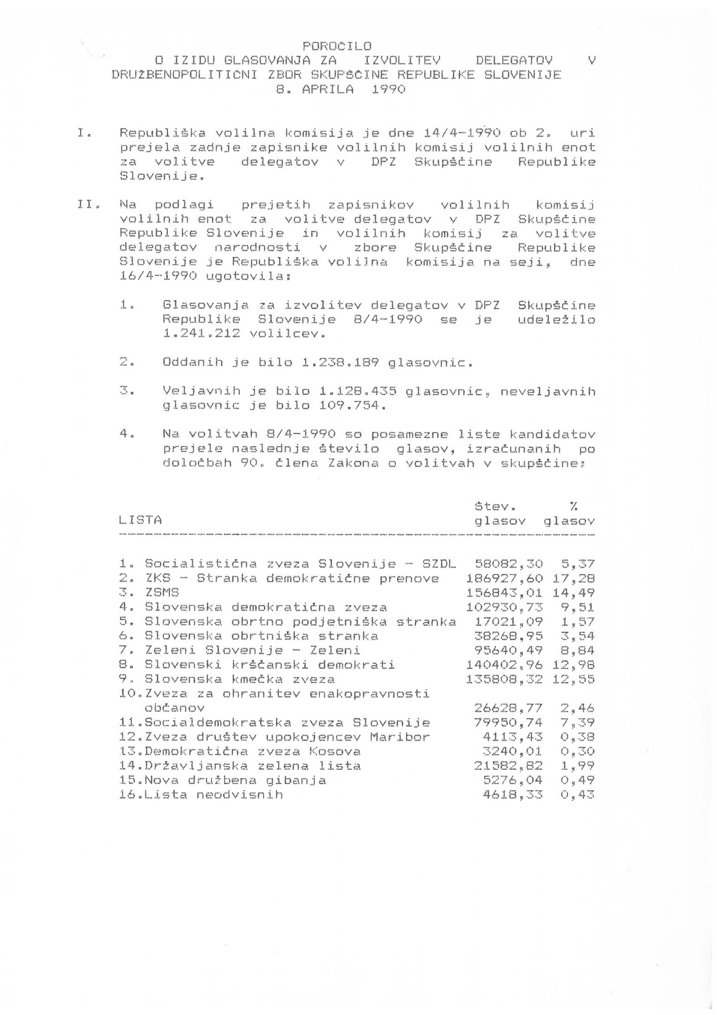 Na podlagi prejetih zapisnikov volilnih komisij volilnih enot za volitve delegatov v Družbenopolitični zbor Skupščine Republike Slovenije in volilnih komisij za volitve delegatov narodnosti v zbore skupščine je Republiška volilna komisija na seji 16. aprila 1990 ugotovila: glasovanja za izvolitev delegatov v družbenopolitični zbor 8. aprila 1990 se je udeležilo 1.241.212 volivcev. Oddanih je bilo 1.238.189 glasovnic. Veljavnih je bilo 1.128.435 glasovnic, neveljavnih glasovnic je bilo 109.754. Volilna udeležba je bila pričakovano velika. Volilo je približno tri četrtine volilnih upravičencev (76,2 %). Posamezne liste kandidatov so prejele naslednje število glasov: