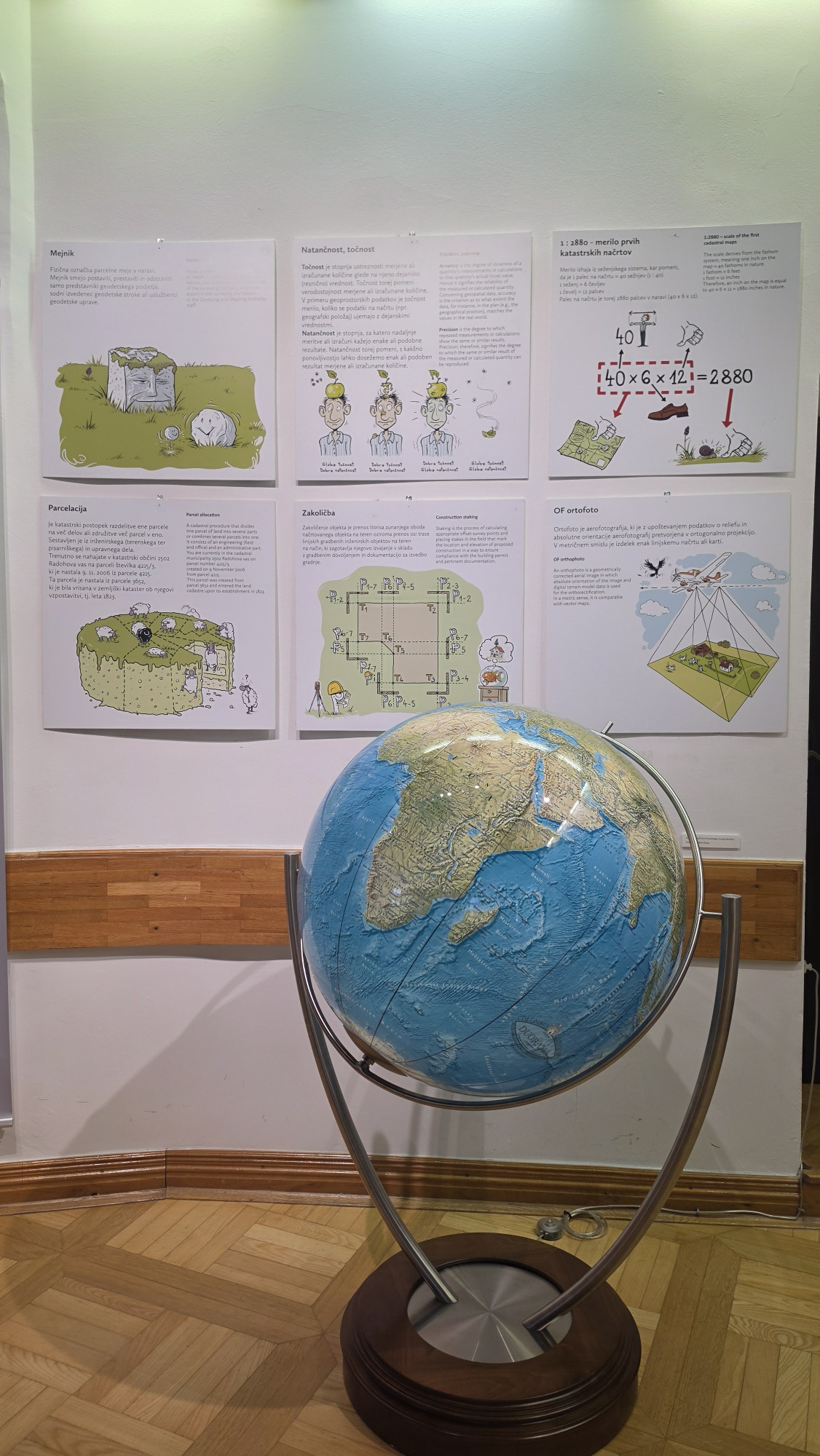 Razstavni globus kot simbol geodezije in kartografije, v ozadju razlage pojmov, ki se uporabljajo v geodeziji | Avtor: Geodetska uprava