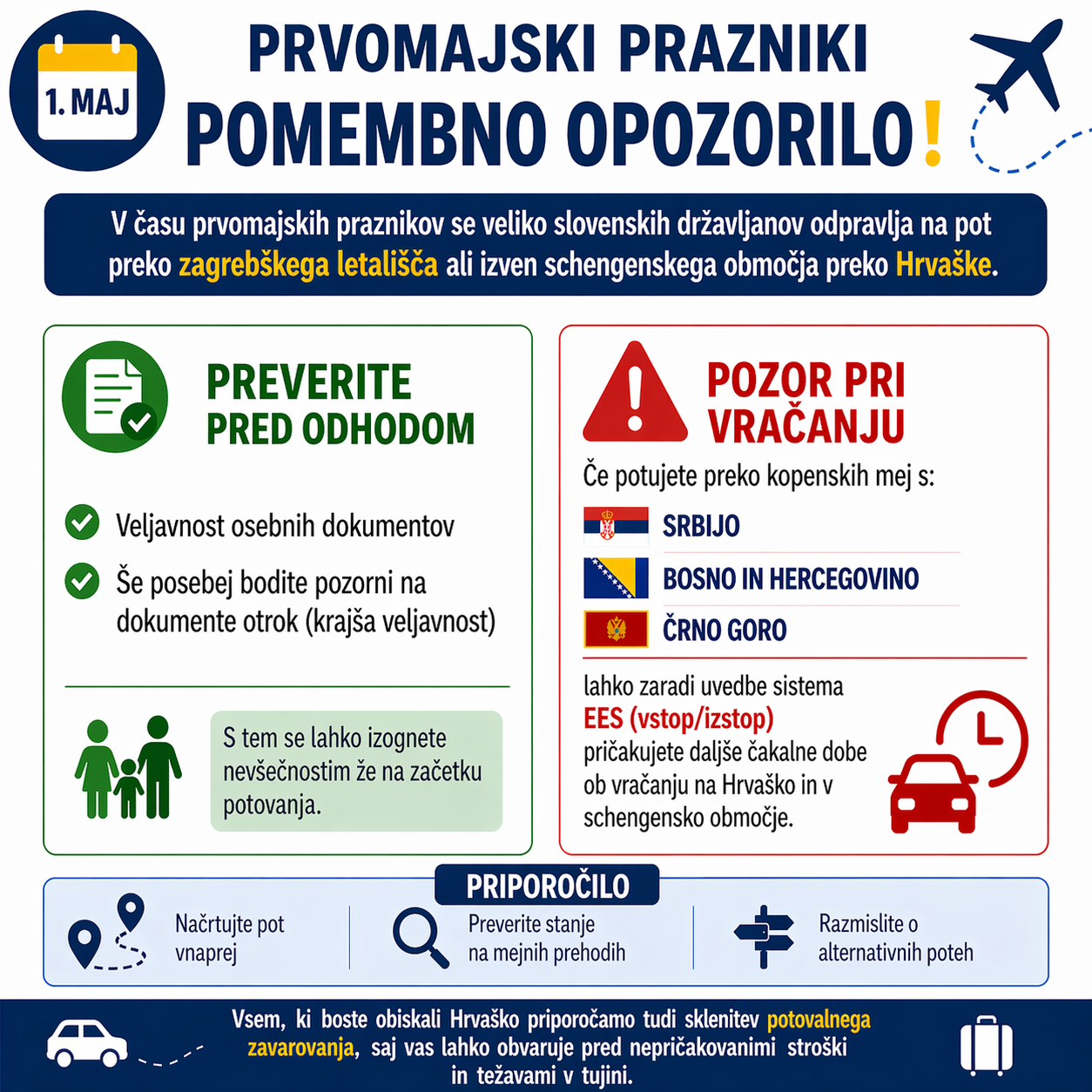 Posebej opozarjamo vse, ki bodo potovali izven schengenskega območja preko kopenskih mej s Srbijo, Bosno in Hercegovino ter Črno goro, da lahko zaradi uvedbe novega Sistema vstopa/izstopa (EES) predvsem ob povratku na Hrvaško pričakujejo daljše čakalne dobe. Svetujemo skrbno načrtovanje poti ter preverjanje alternativnih mejnih prehodov.