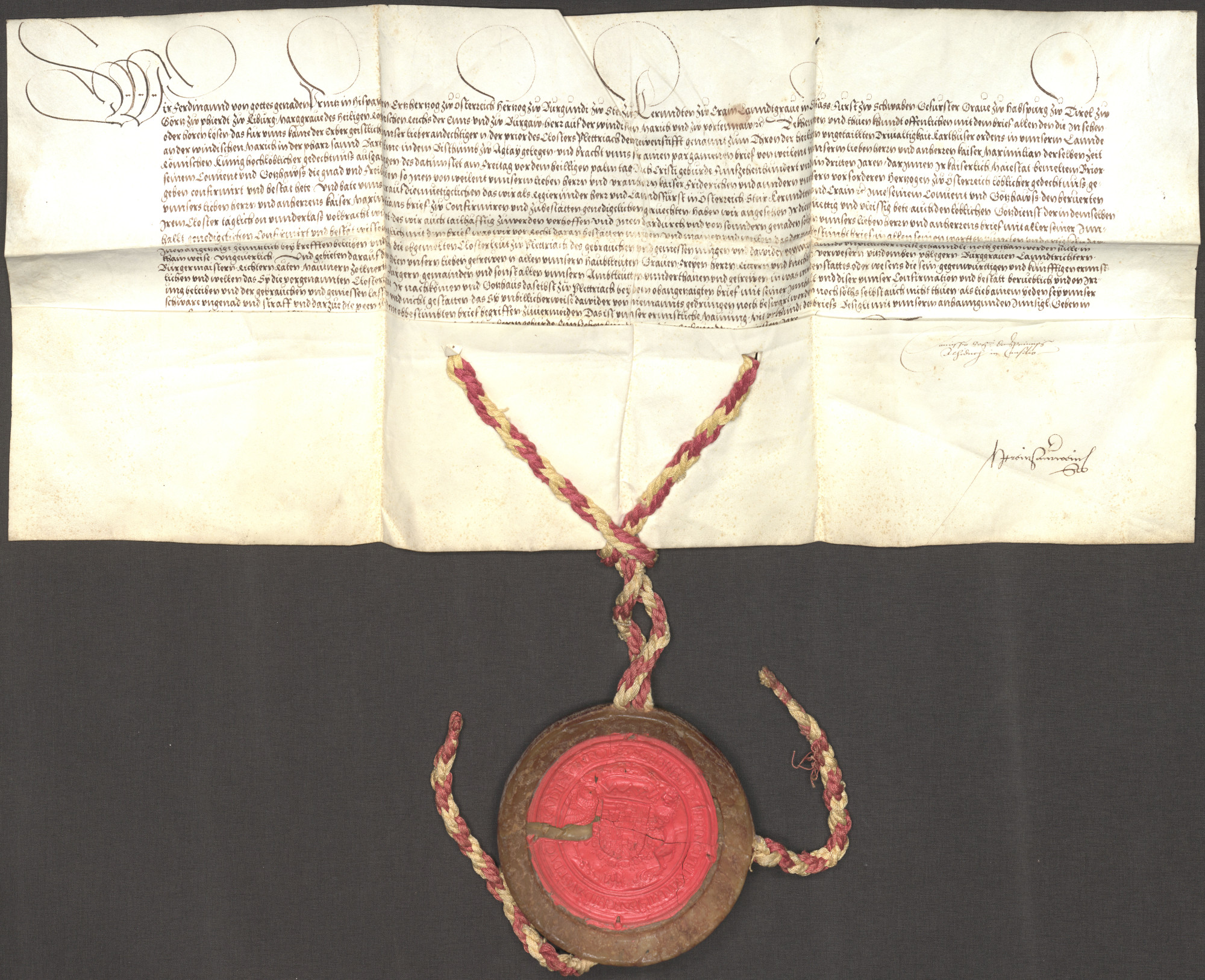 Original, pergament, 57 cm × 25,5 cm, okrogel viseči pečat avstrijskega nadvojvode Ferdinanda I. Habsburškega iz rdečega voska, premera 8,4 cm, v okrogli skodelici iz naravnega voska, premera 11,6 cm, pritrjen z rumeno-rdečo pleteno svileno vrvico