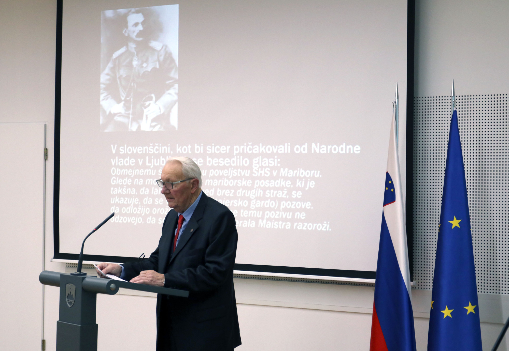 Minister Karl Erjavec je v svojem govoru poudaril, da je bil general Rudolf Maister vrhunski vojaški poveljnik, ki je ob koncu 1. svetovne vojne začutil, da prihaja zgodovinski trenutek in čas odločitve ter znal motivirati svoje borce, da so obranili slovensko severno mejo. »To je bil čas, ko smo lahko izkoristili prvo priložnost za to, da pridemo do samostojne, neodvisne Slovenije. To so bile sanje mnogih generacij, mnogi so dali svoje življenje za ta cilj. Dejanje generala Maistra zato štejem kot prvi korak k naši državi,« je poudaril minister Erjavec. V nadaljevanju je dejal, da so boj generala Rudolfa Maistra in njegovih soborcev za slovensko severno mejo, slovenski narodnoosvobodilni partizanski boj in vojna za samostojno Slovenijo temelji naše državnosti oziroma trije naši zgodovinski stebri. »Zavedati se moramo, da Slovenci imamo svojo vojaško tradicijo«, je še poudaril. Spomnil je tudi na udejstvovanje generala Maistra v kulturi in umetnosti ter dejal, da je Rudolf Maister ena izmed največjih slovenskih zgodovinskih osebnosti.