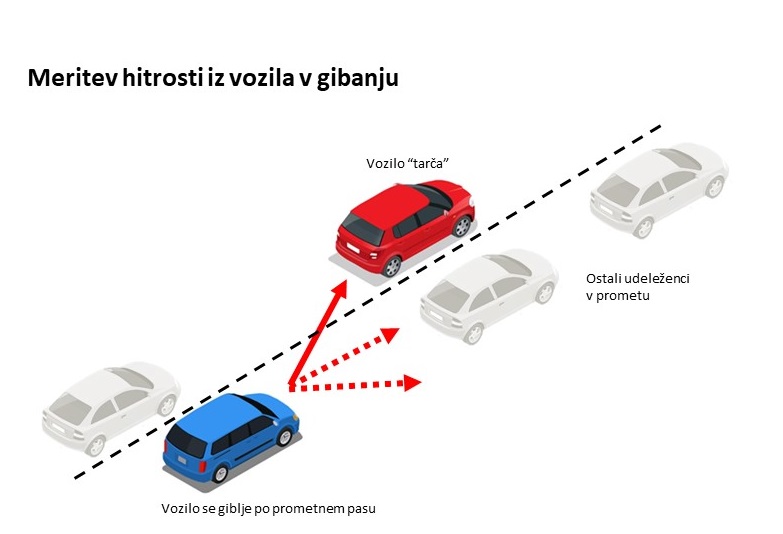 Vozilo smo v tem primeru uporabili za tarčo merilnika hitrosti nove generacije, ki omogoča meritve hitrosti vozil ostalih udeležencev v prometu iz vozila v gibanju (npr. policijskega oziroma redarskega vozila). Tovrstne meritve se imenujejo meritve iz premične točke, ker je potrebno pri meritvah upoštevati in izmeriti hitrosti vozila, kjer je merilnik hitrosti vgrajen. Slednje pomeni, da moramo v postopku odobritve tipa preskusiti večje število prometnih situacij, kot pri običajnih merilnikih hitrosti, ki so nameščeni fiksno nameščeni v ohišja ob voznih pasovih oziroma nad cestiščem. Zanimajo nas, kako sistem meri na cestah z dvema ali več pasovi, v urbanih okoljih, v ovinkih, rondojih, tunelih, pod nadvozih ter podobno.