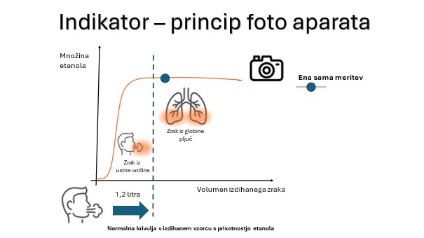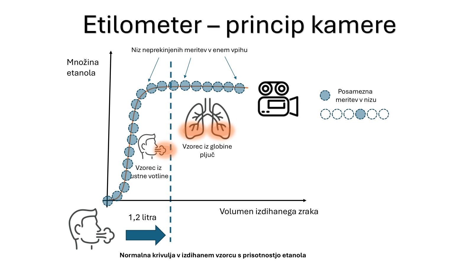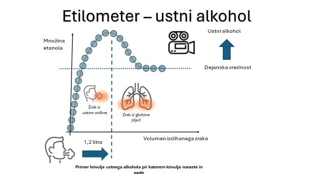 Za merjenje koncentracije alkohola v izdihanem zraku je ključno, da se za meritev odvzame izdihan zrak iz spodnjega, ne zgornjega dela pljuč. Samo koncentracija alkohola iz spodnjega dela pljuč je enakovredna koncentraciji alkohola v krvi s primernim faktorjem pretvorbe. Koncentracija alkohola v izdihanem zraku se od začetka do konca vpiha spreminja po določeni krivulji. Povedano najlažje grafično ponazorimo s Sliko 1: Normalna krivulja v izdihanem vzorcu s prisotnostjo etanola.