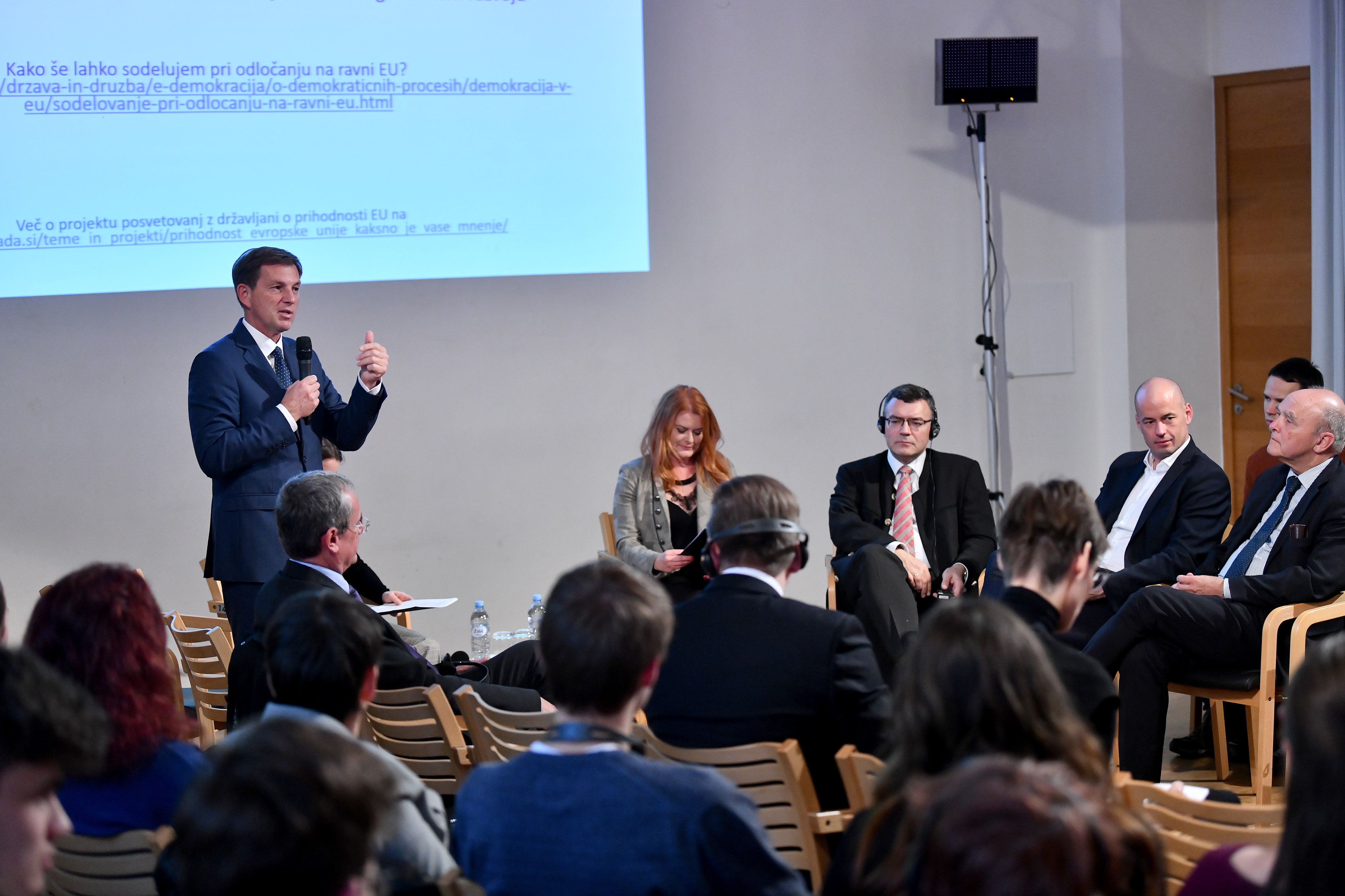 Zunanji minister dr. Miro Cerar in bavarski državni minister za evropske in zvezne zadeve ter medije dr. Florian Herrmann v Škofji Loki na razpravi z državljani o prihodnosti Unije