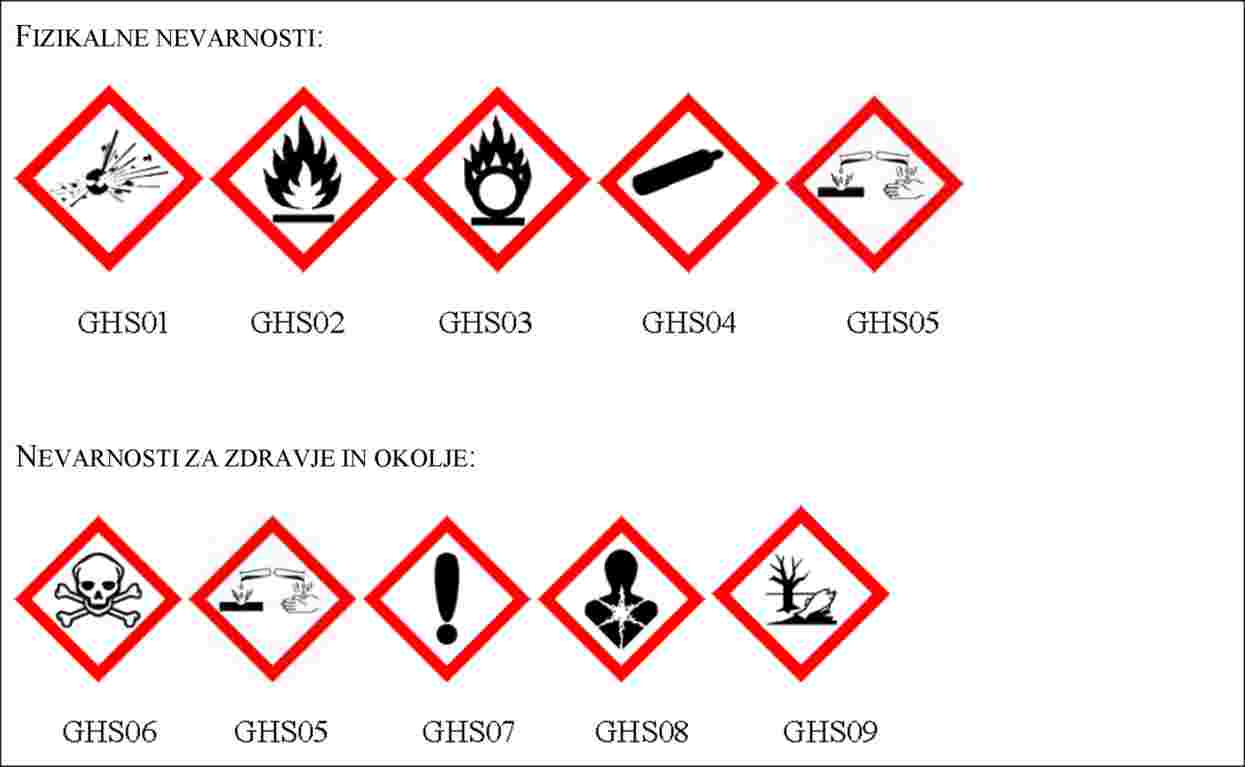 - piktograme, ki omogočajo, da vsi uporabniki že po hitrem, prvem pogledu na etiketo prejmejo informacije, da razpolagajo z določeno vrsto nevarne kemikalije,