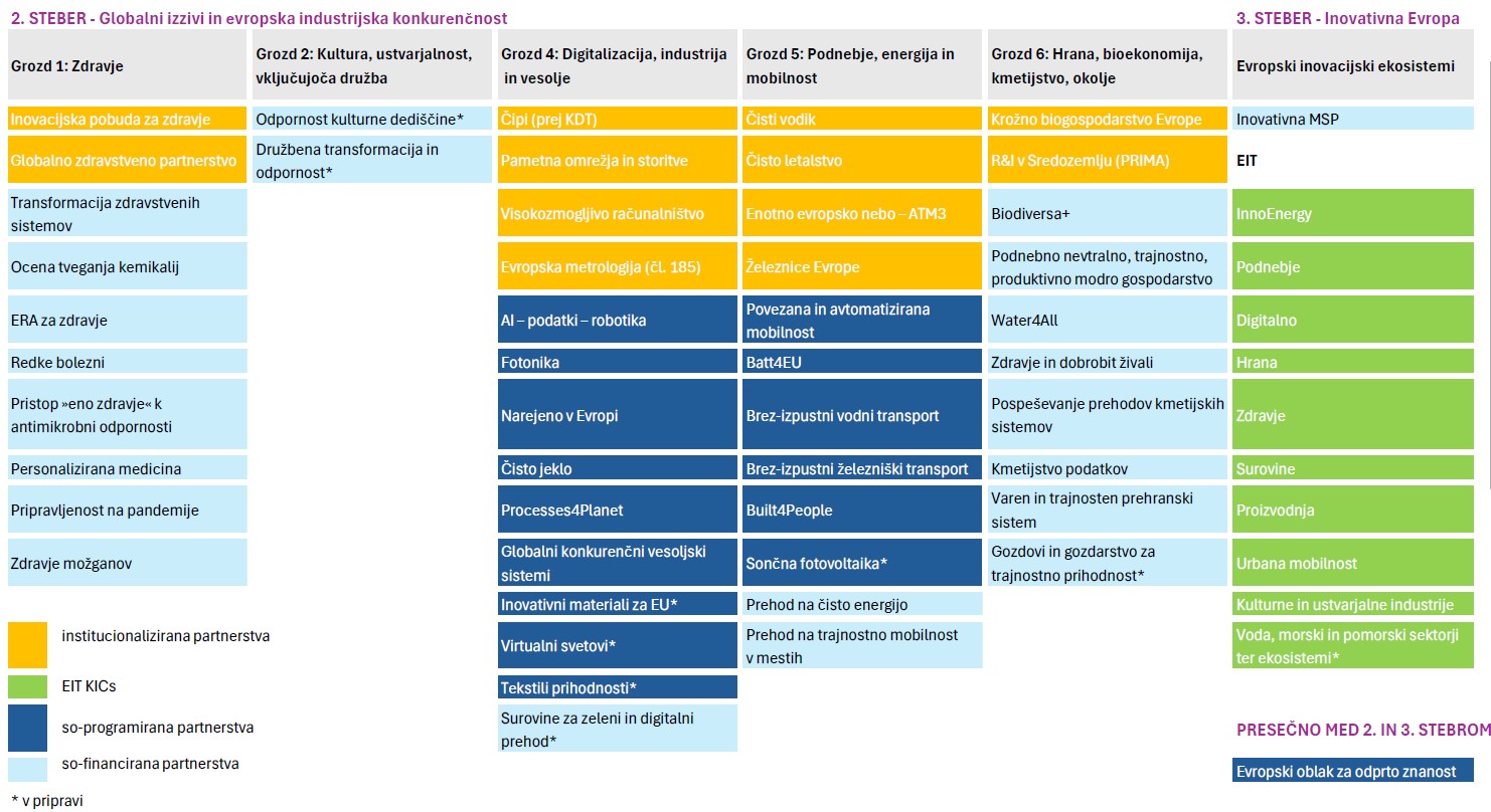 Na podlagi posodobljene analize potreb in posvetovanj z državami članicami, industrijo in raziskovalno skupnostjo je bilo v letu 2024 potrjenih 9 novih partnerstev, ki bodo vključena v delovne programe Obzorja Evropa v obdobju 2025–2027. Med njimi so tako predlogi za nova so-financirana in so-programirana partnerstva, ki odgovarjajo na aktualne izzive, kot so kritične surovine, obnovljivi viri energije, les in lesarstvo, napredna proizvodnja ter digitalna varnost in umetna inteligenca.